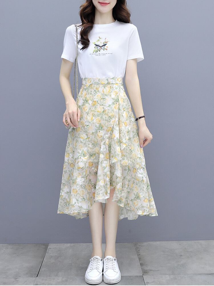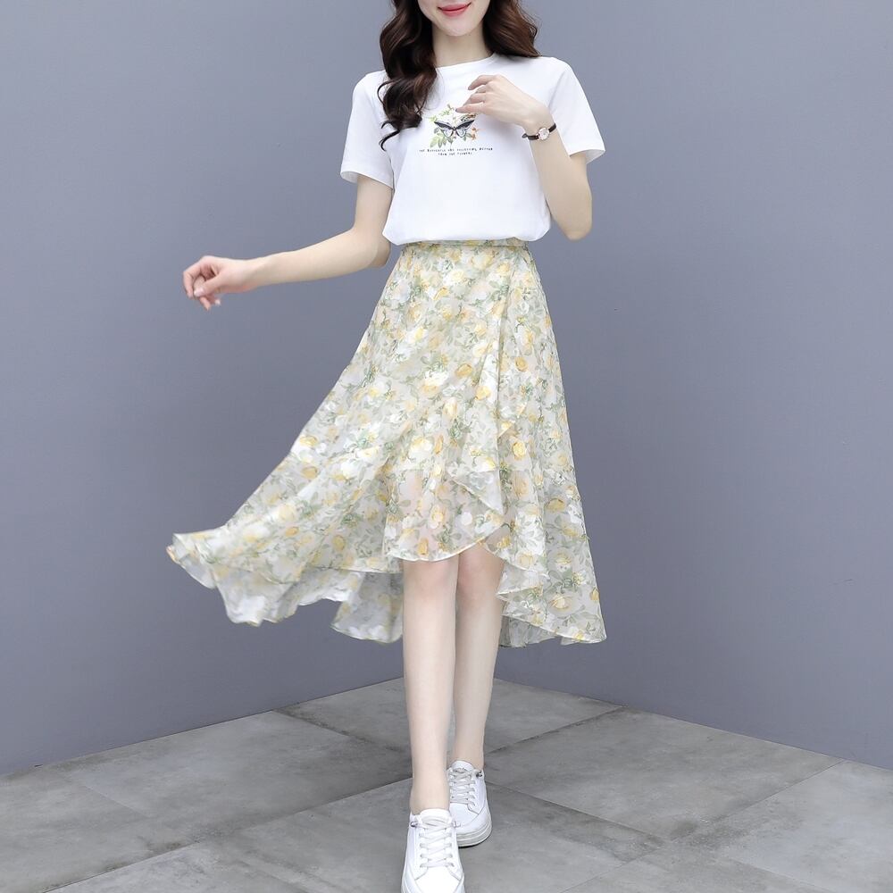 シフォンハイウェストウェストロングスカート サマープリントTシャツ フローラルAラインセット 大きめサイズ 夏物 花柄 muto90240954423
