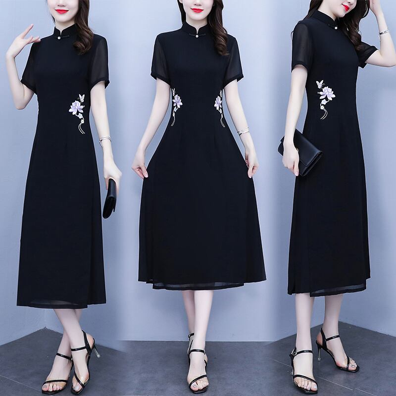 ロングシフォンスタンダードスタンドカラーカラードレス レッド レトロ 刺繍 大きめサイズ muto10249706733