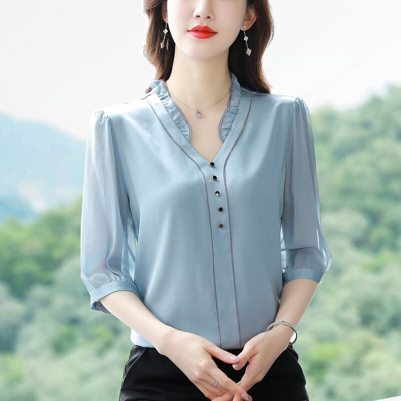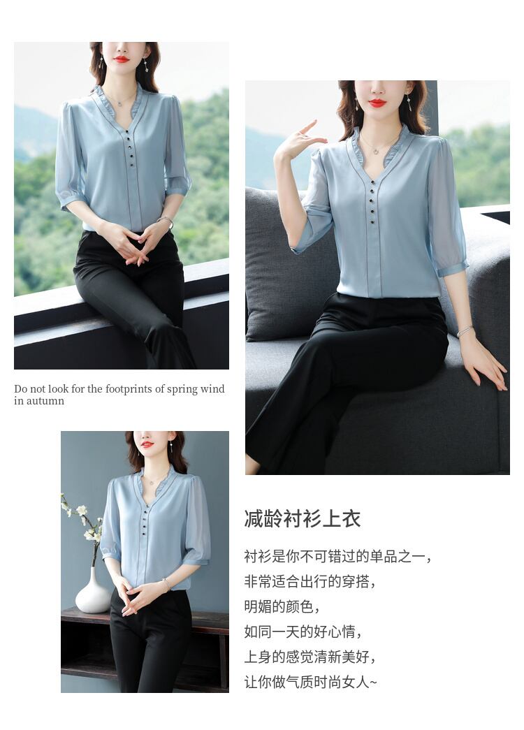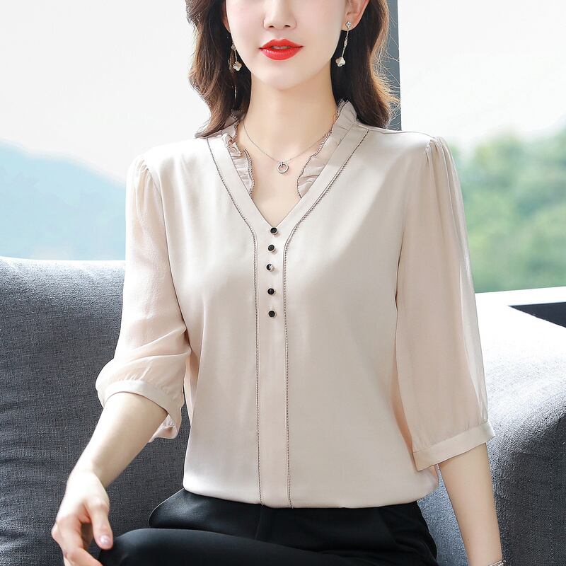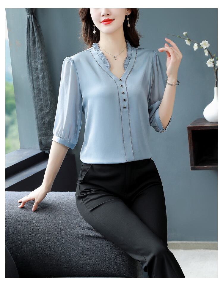 シャツ サマーVネックサテントップス 大きめサイズ 夏物 シルク muto24475020655