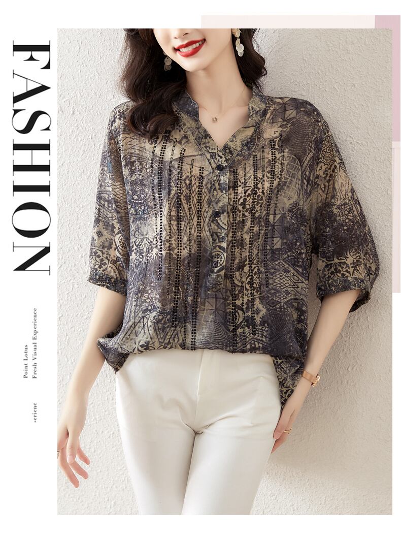 薄手サマープリントトップス Vネックシフォンシャツ 大きめサイズ 夏物 muto34154779864