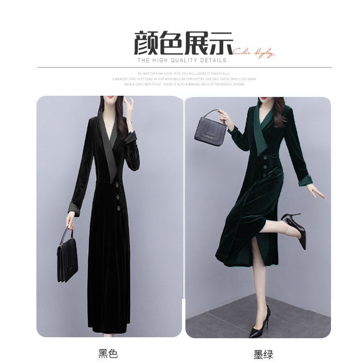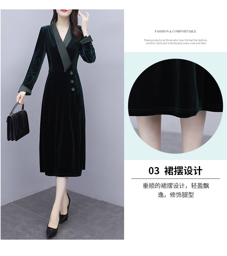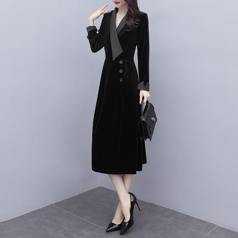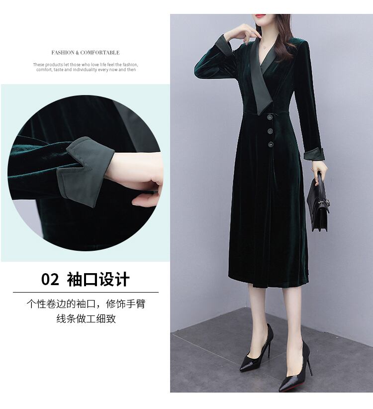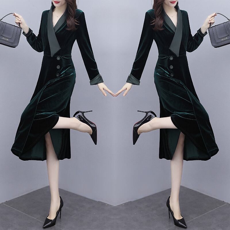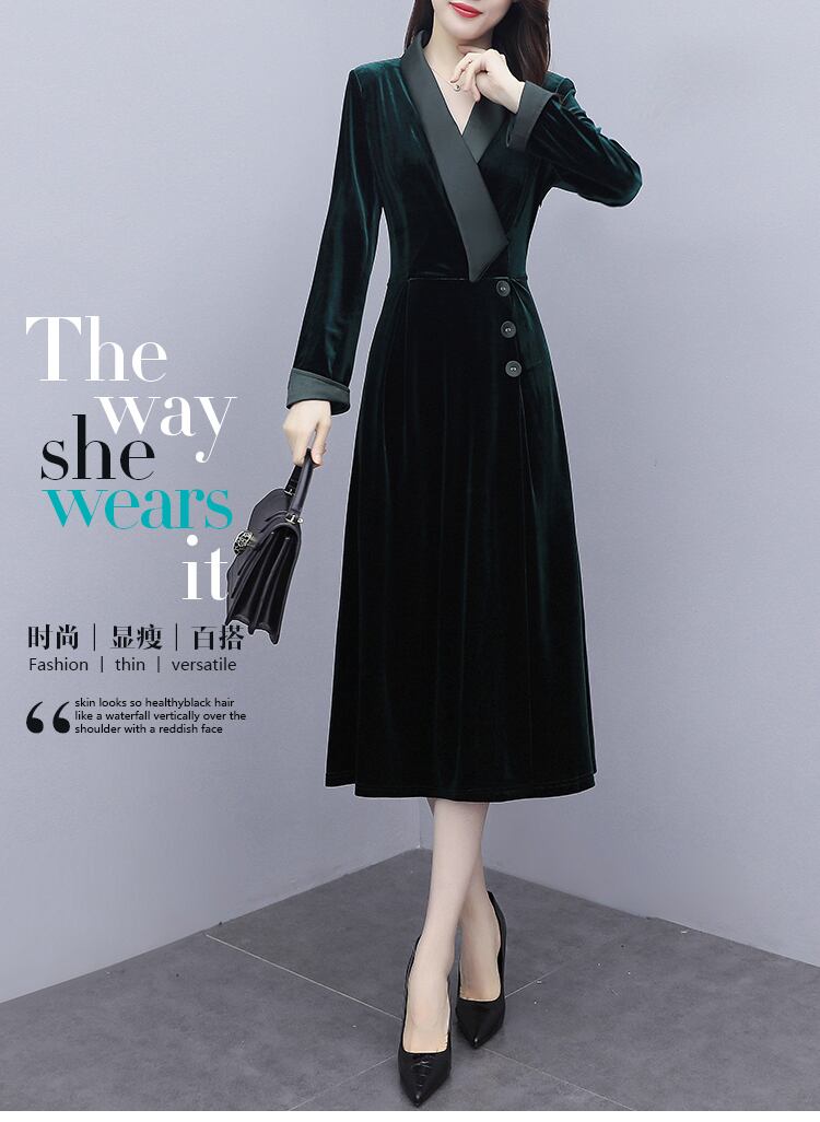 ゴールドベルベットドレス スプリングオータムVネックスカート ロング 大きめサイズ 春物 秋物 muto69931815145