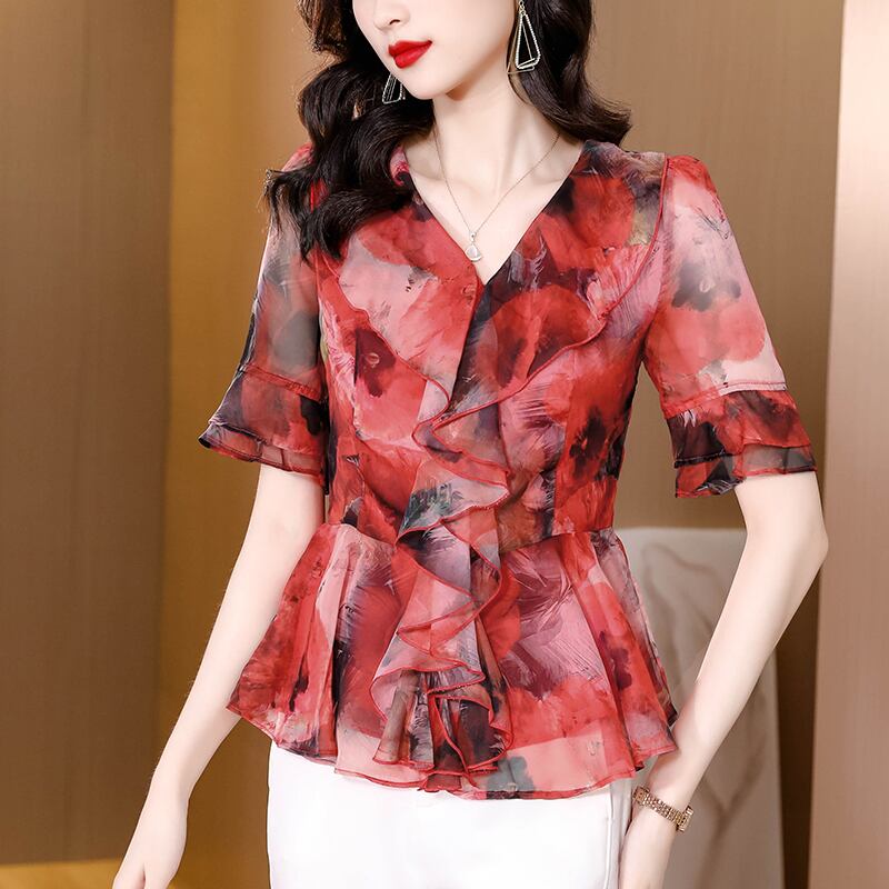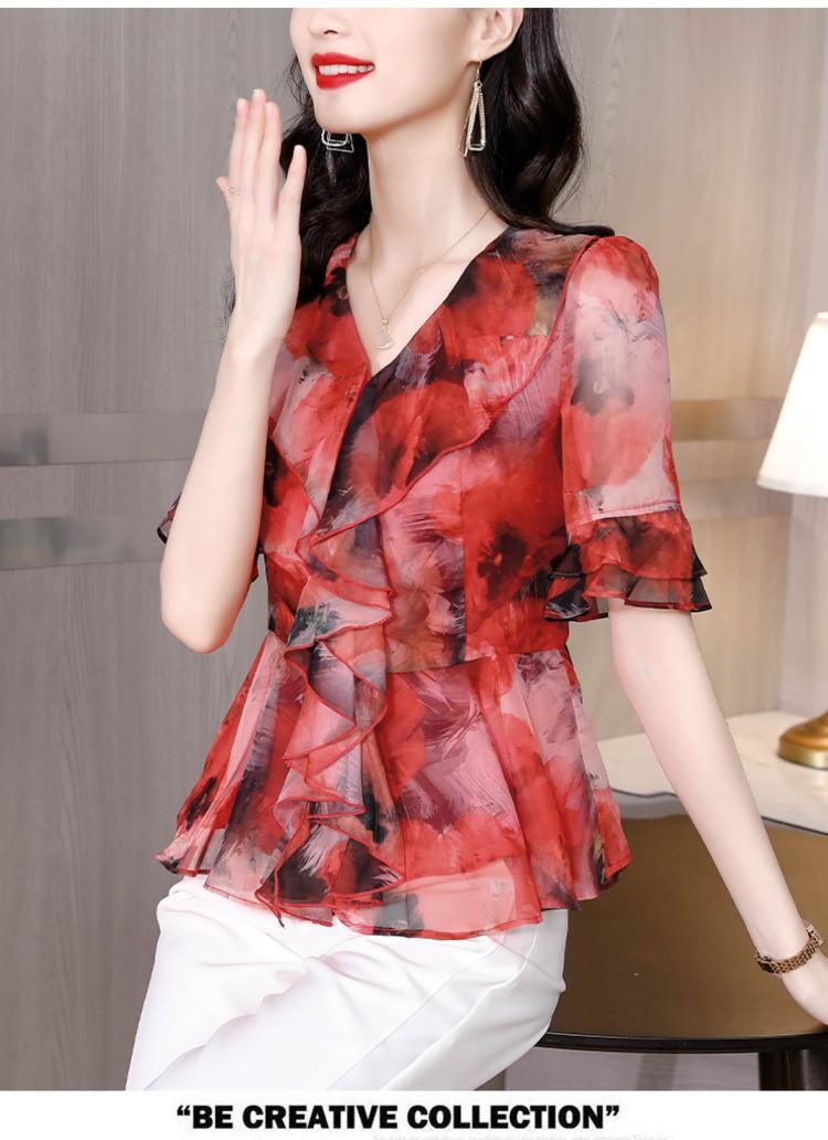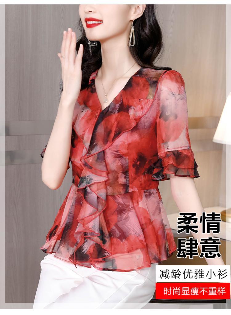 シフォンプリントトップス サマースリムシャツ 大きめサイズ 夏物 muto82665385552