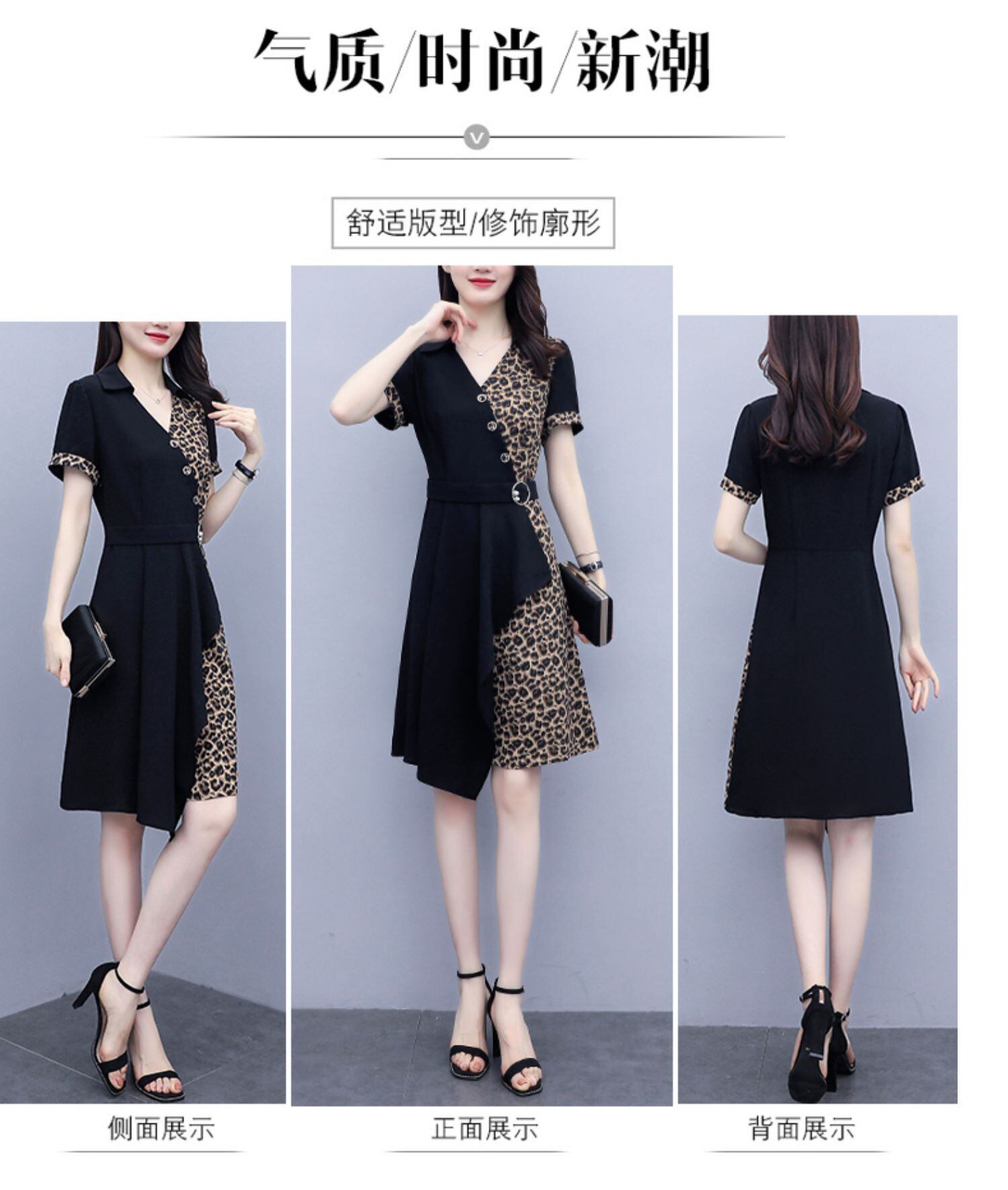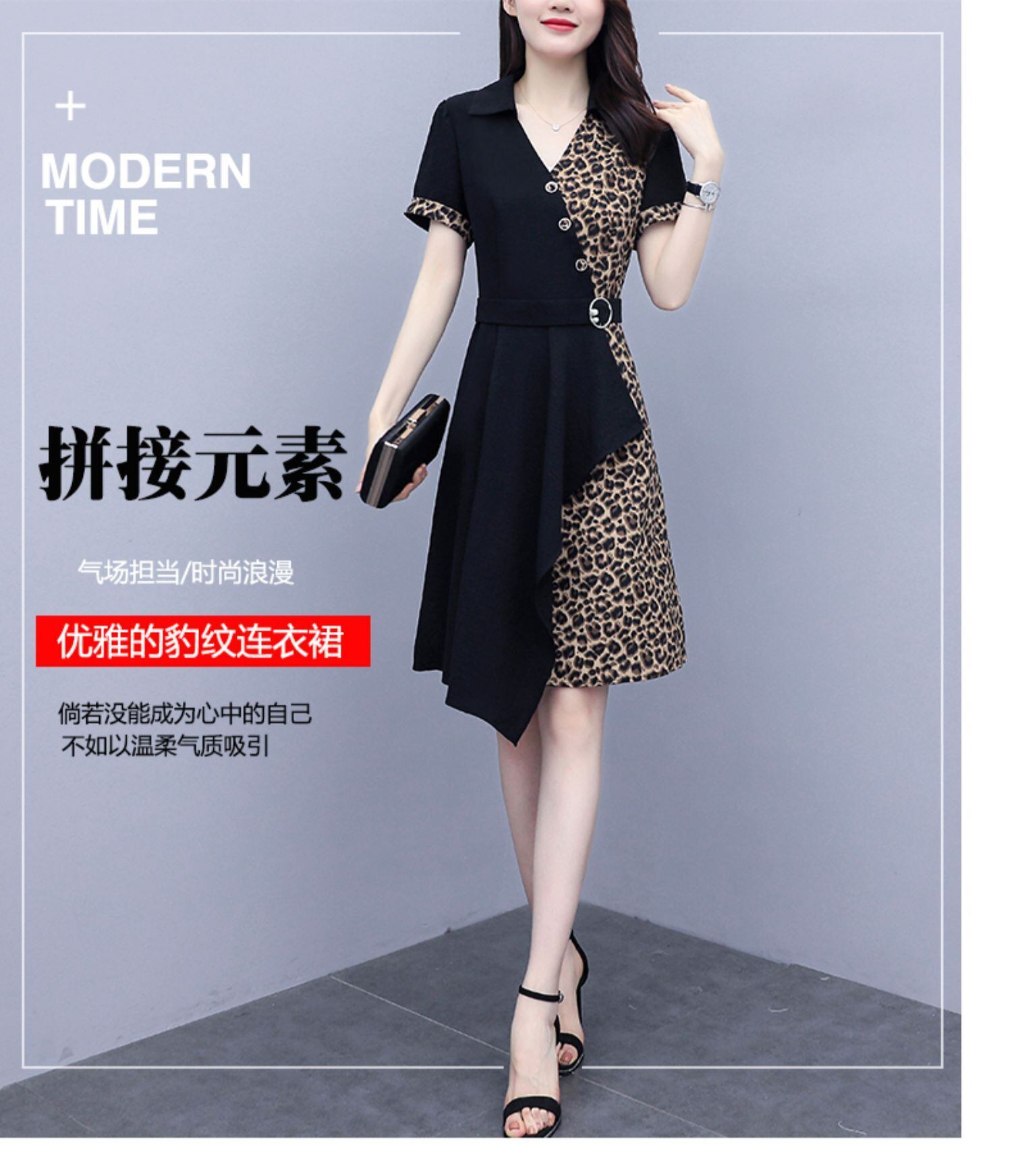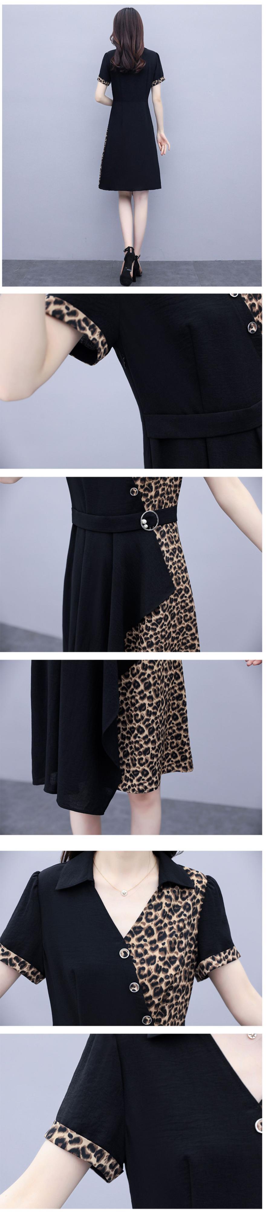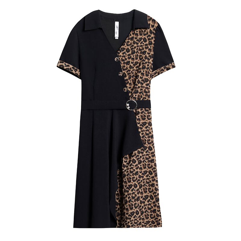 サマーレオパードプリント柄スリムフィットVネックドレス 大きめサイズ 夏物 ステッチ muto61747621723