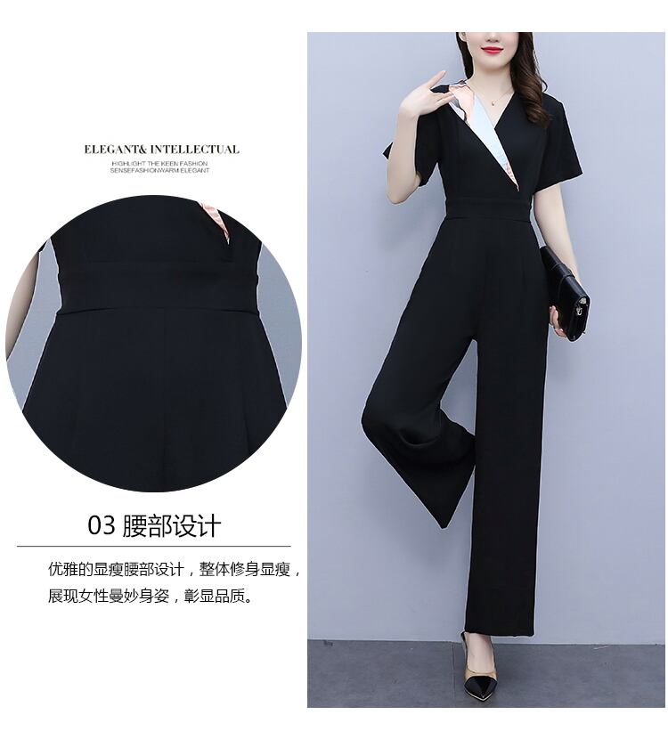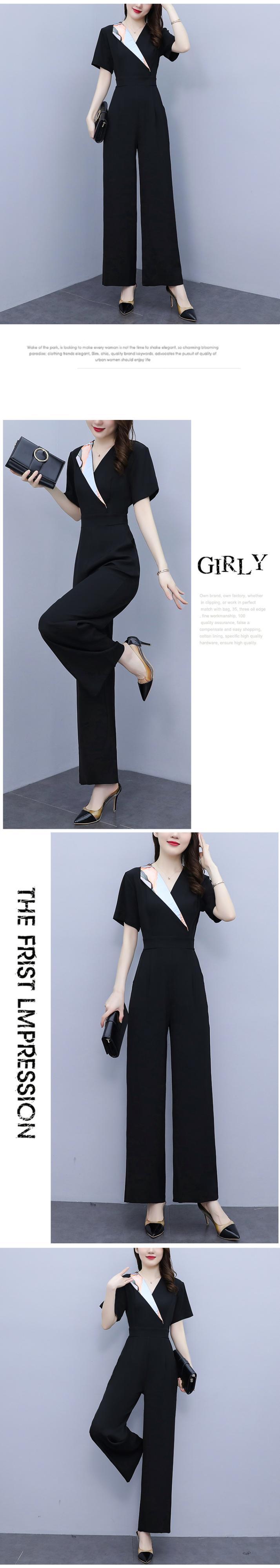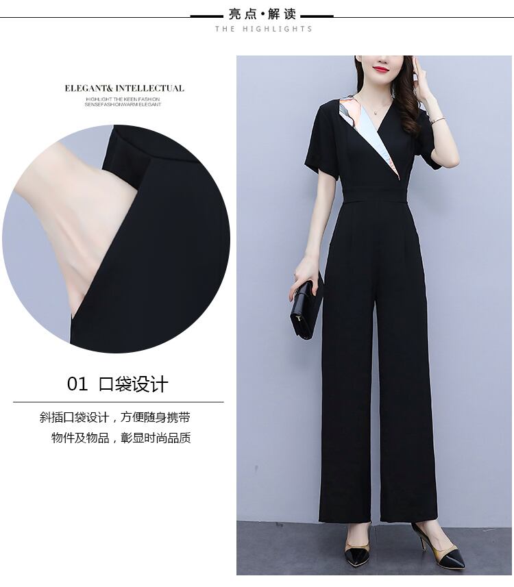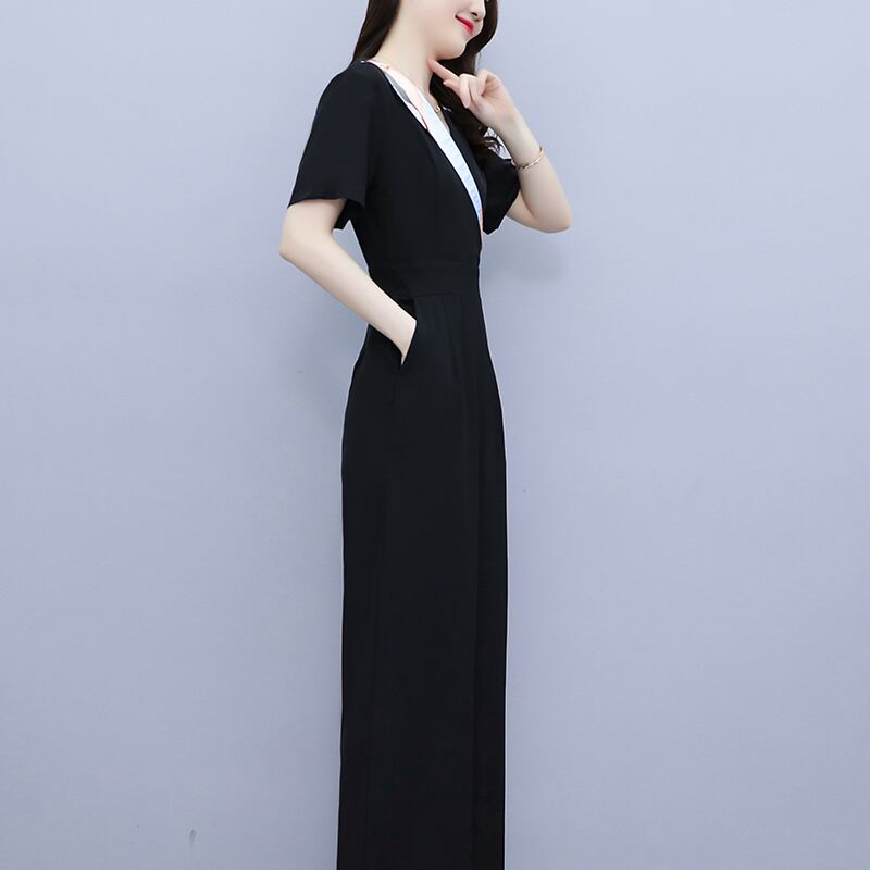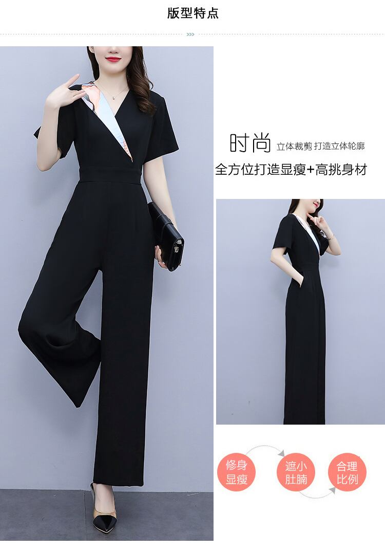 ブラックVネックシフォンジャンプスーツ オールインワン サマーハイウェストウェスト薄手 大きめサイズ 夏物 muto79315718554