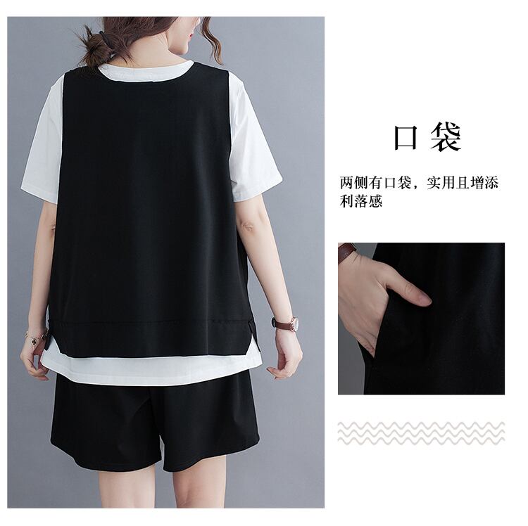薄手ショーツ ルーズスタイルブラックホワイトカラーラウンドネックTシャツ セット レディース 大きめサイズ ブルマー Oネック muto23357826726
