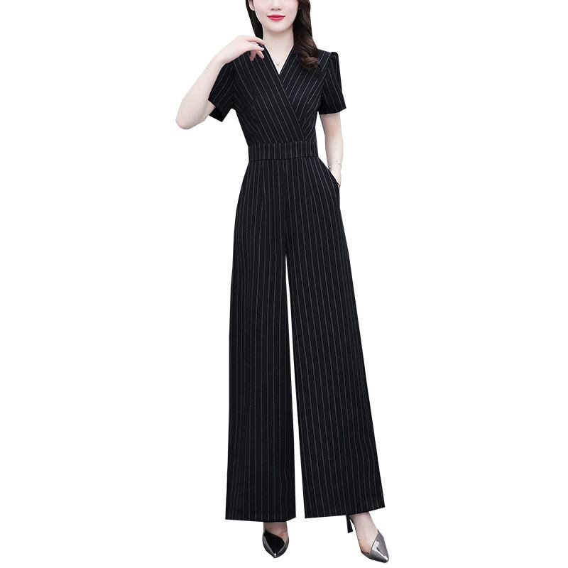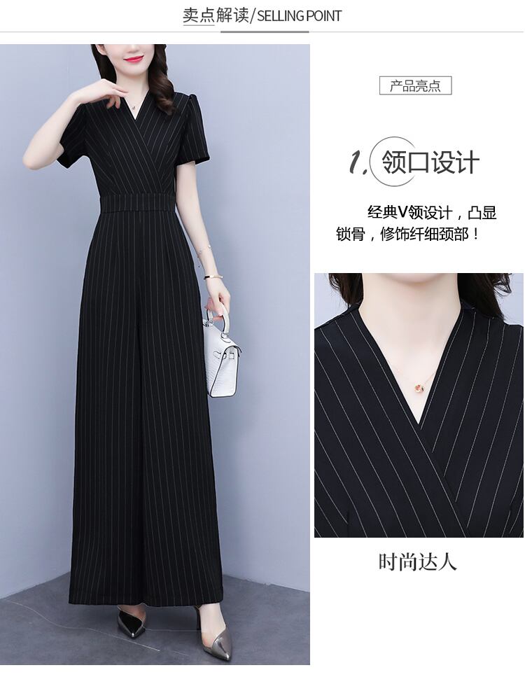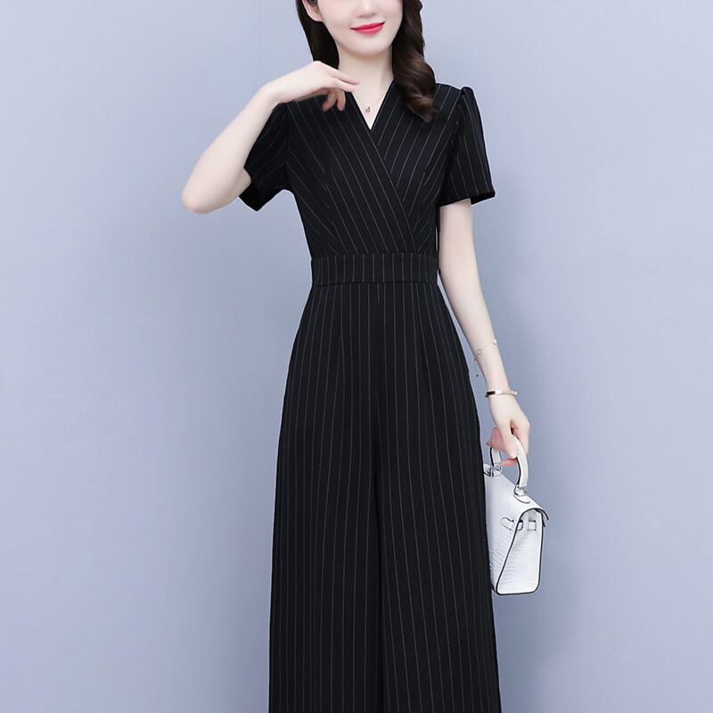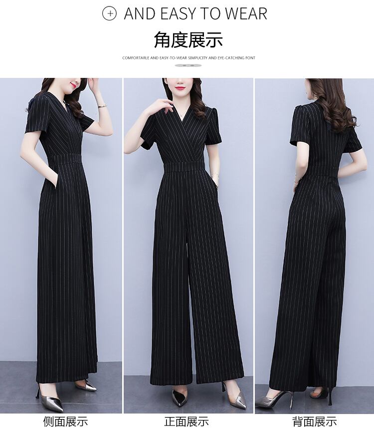 ジャンプスーツ オールインワン サマーハイウェストウェストスリムストライプワイドレッグパンツ 大きめサイズ 夏物 ワイドパンツ muto80931913065