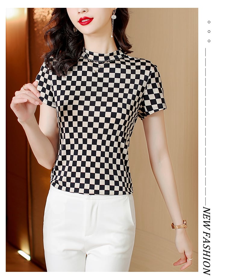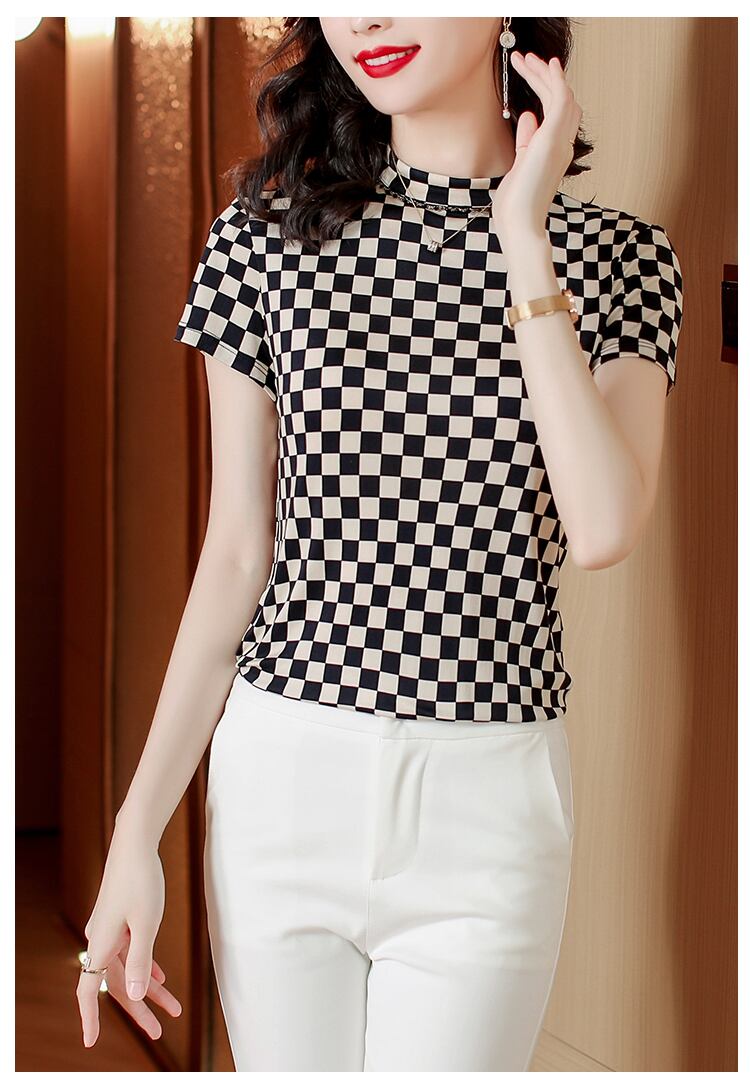 ブラックホワイト格子柄トップス サマープリント薄手シャツ 大きめサイズ 夏物 シルク muto84035042805