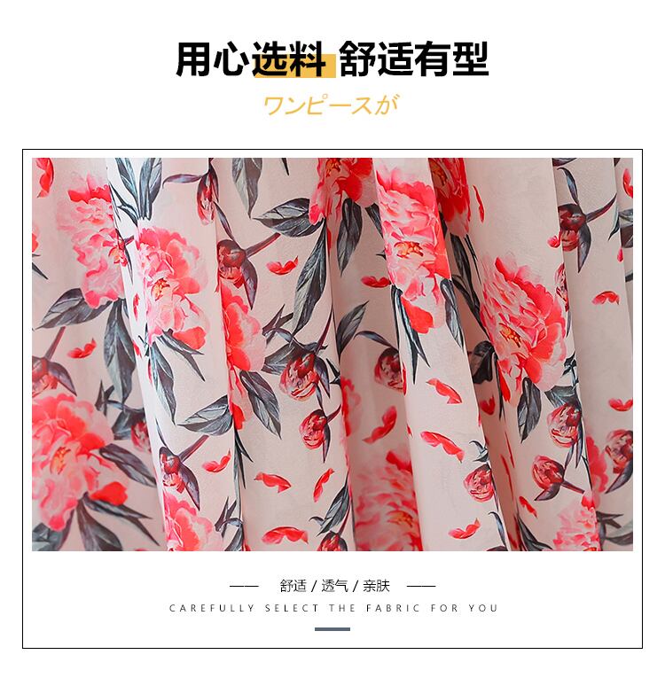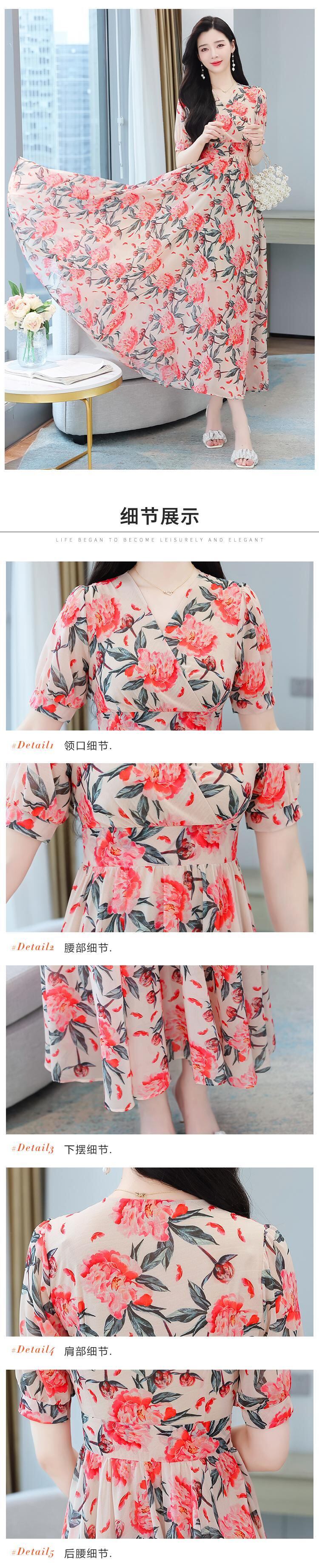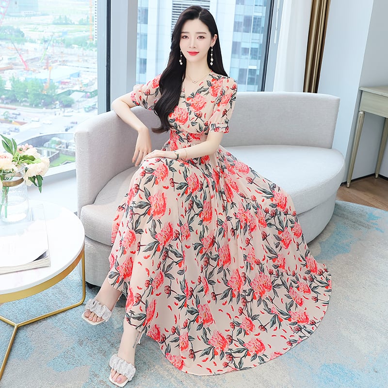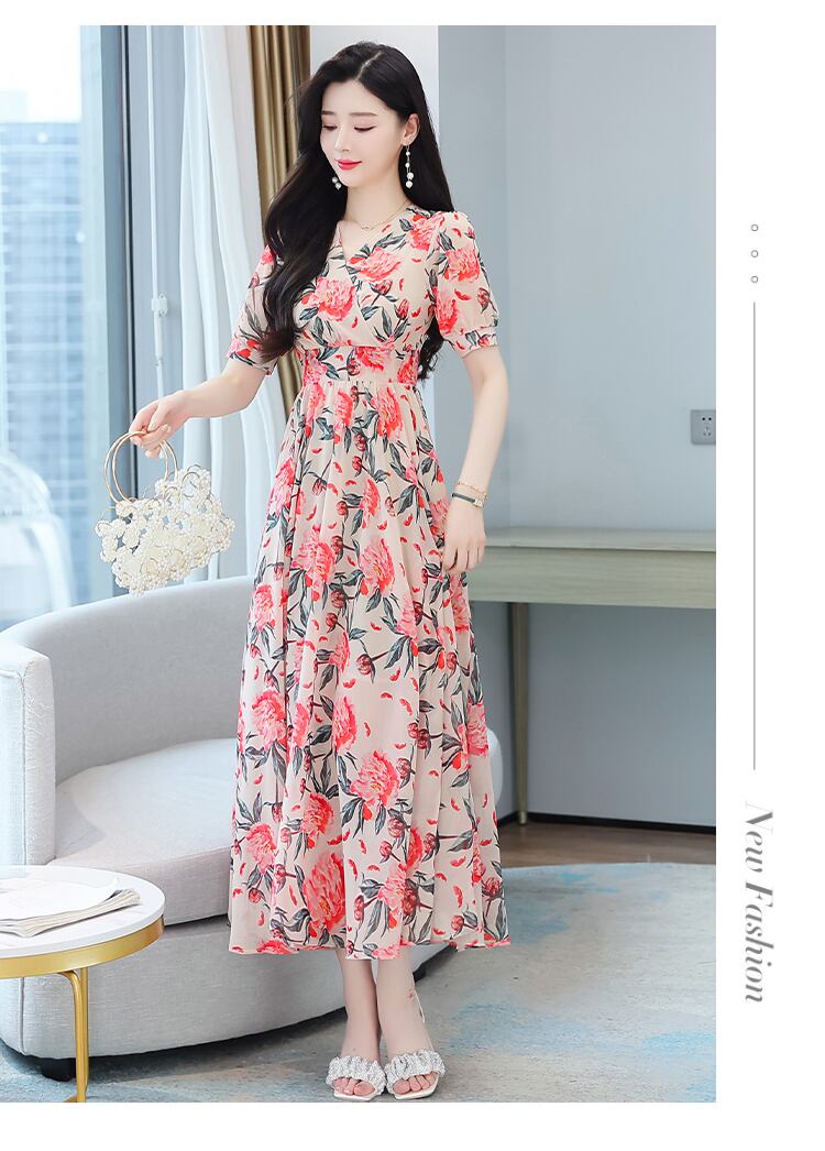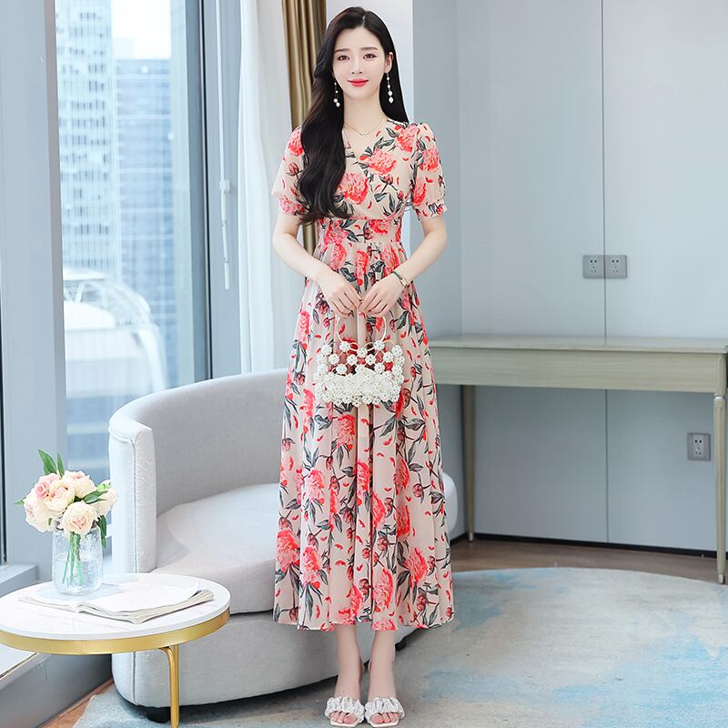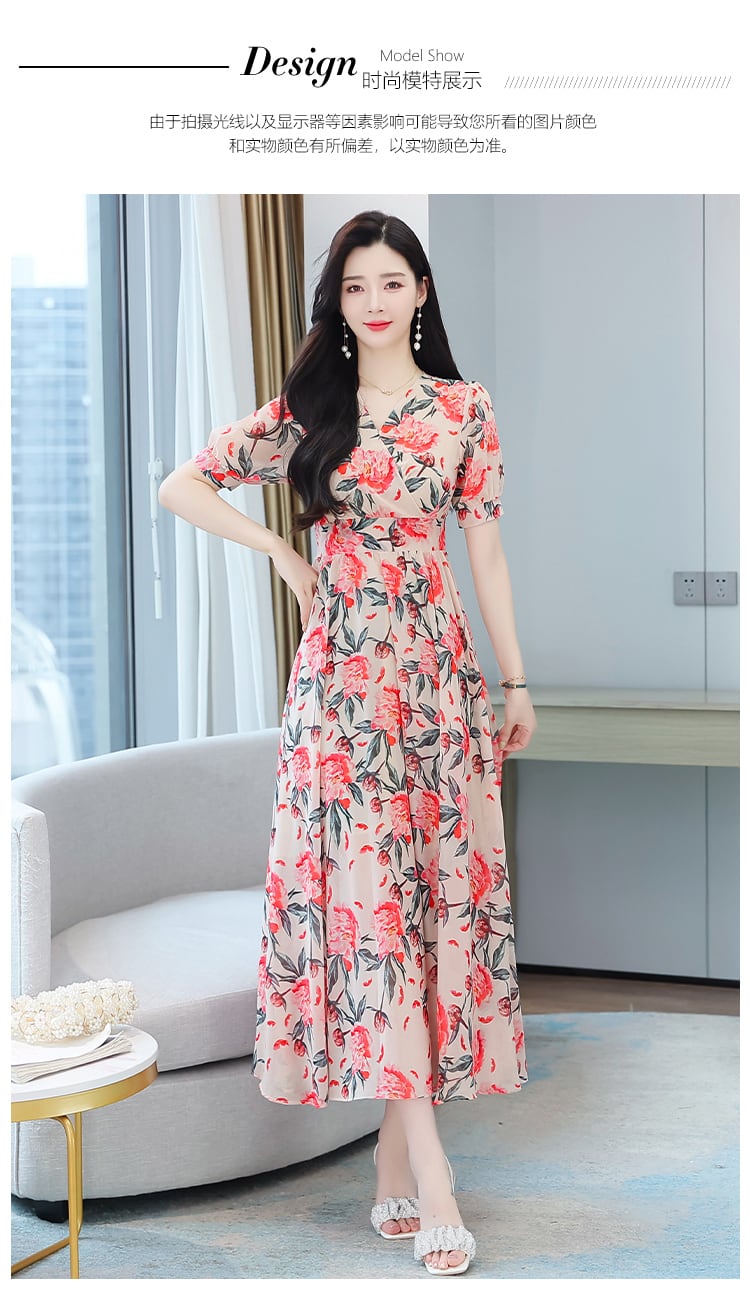 フローラルアンクルロングドレス サマースリムVネックシフォン 大きめサイズ 夏物 花柄 muto424079345