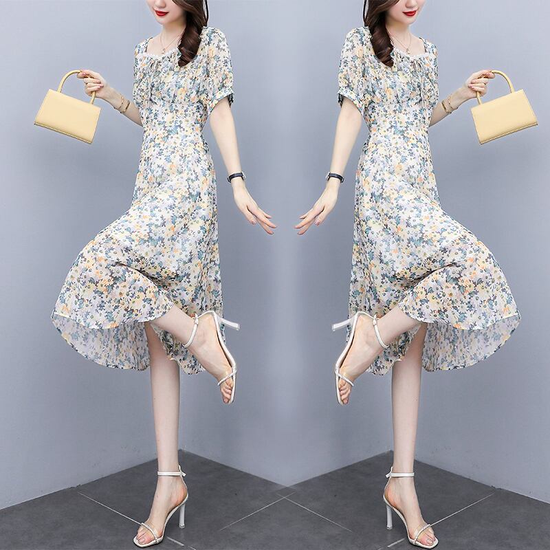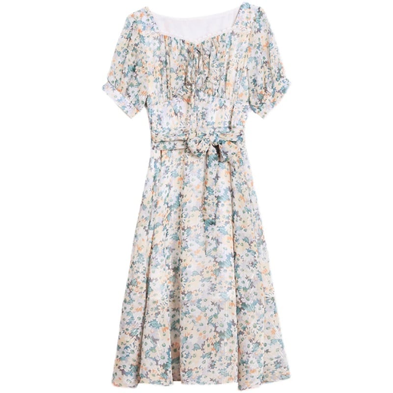サマーフローラルシフォンドレス スリムハイウェストウェストVネックスカート 大きめサイズ 夏物 花柄 muto79580596735