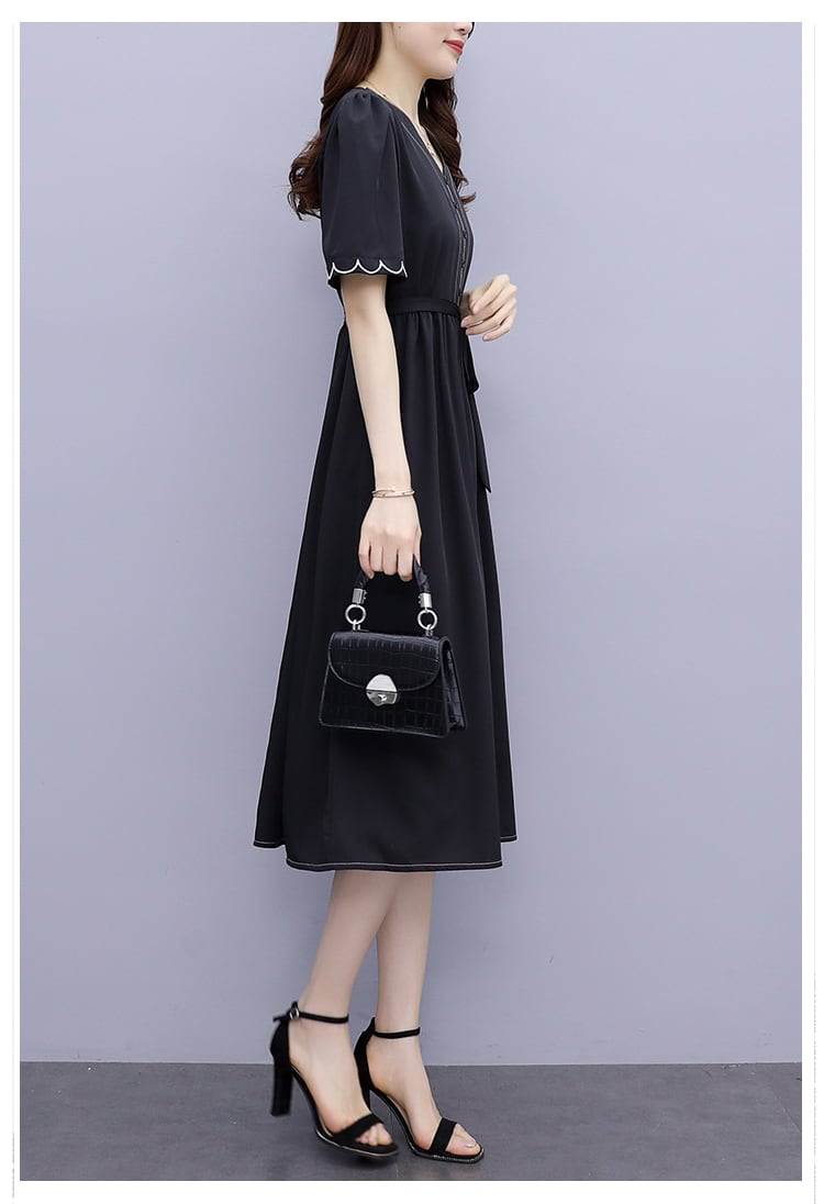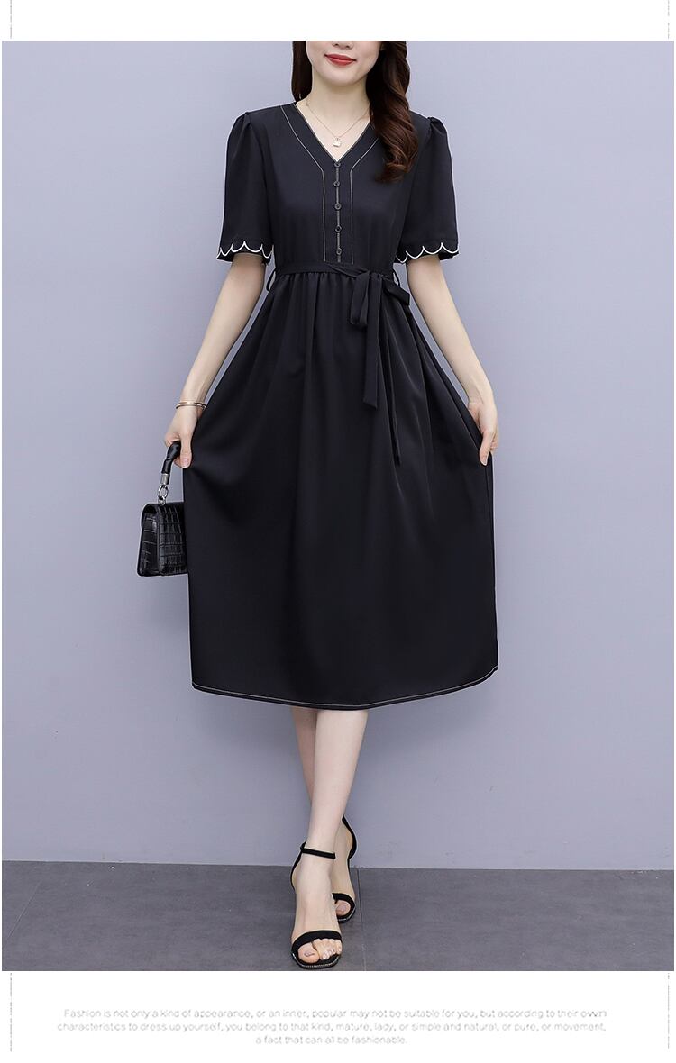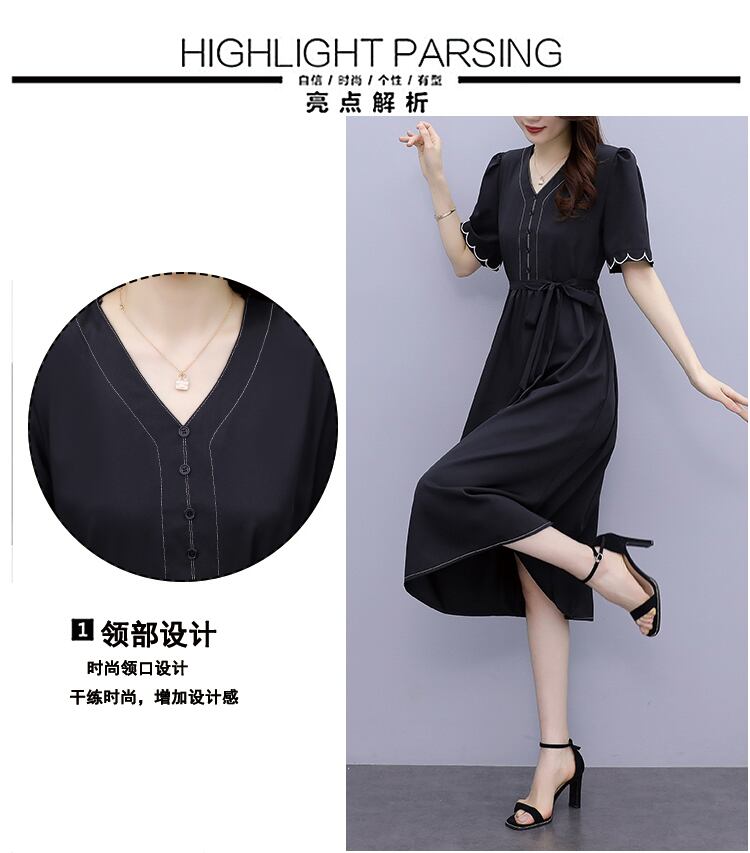 ウェストスリムロングスカート サマードレス スタンダードブラック レトロ 大きめサイズ 夏物 muto97955590818