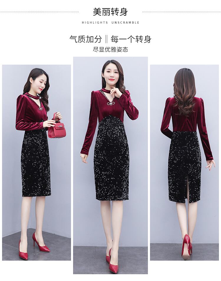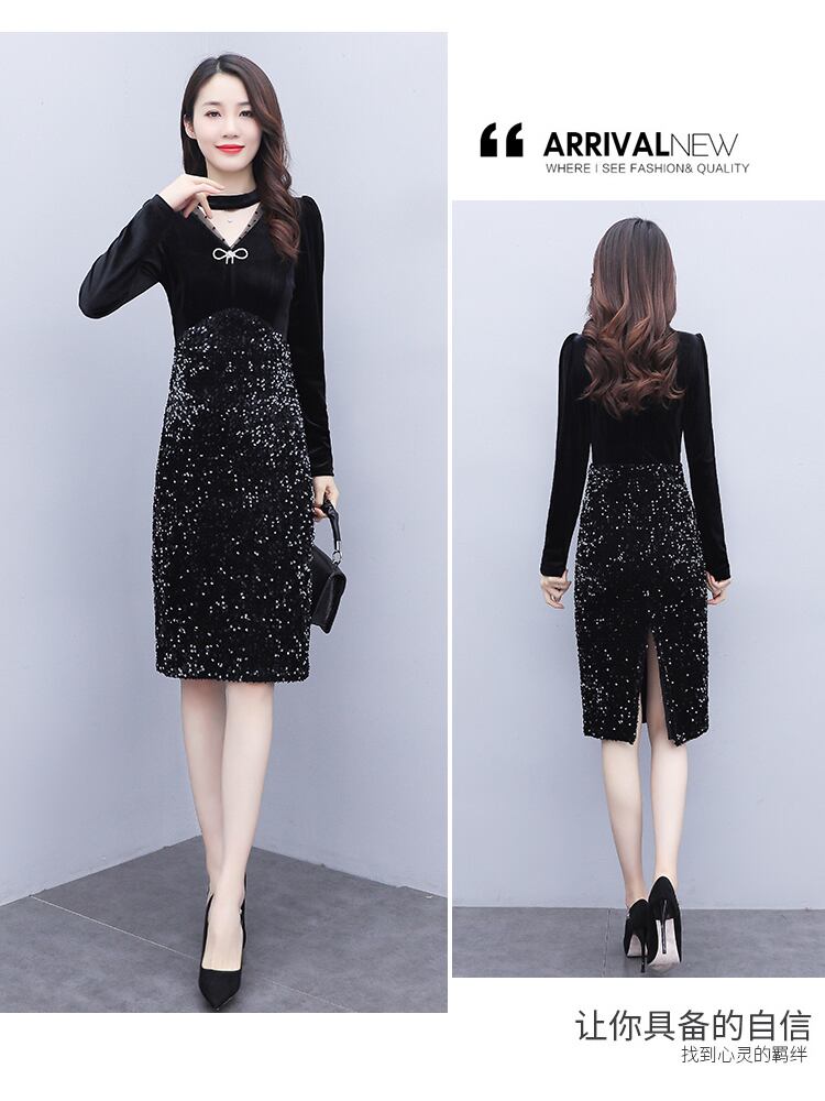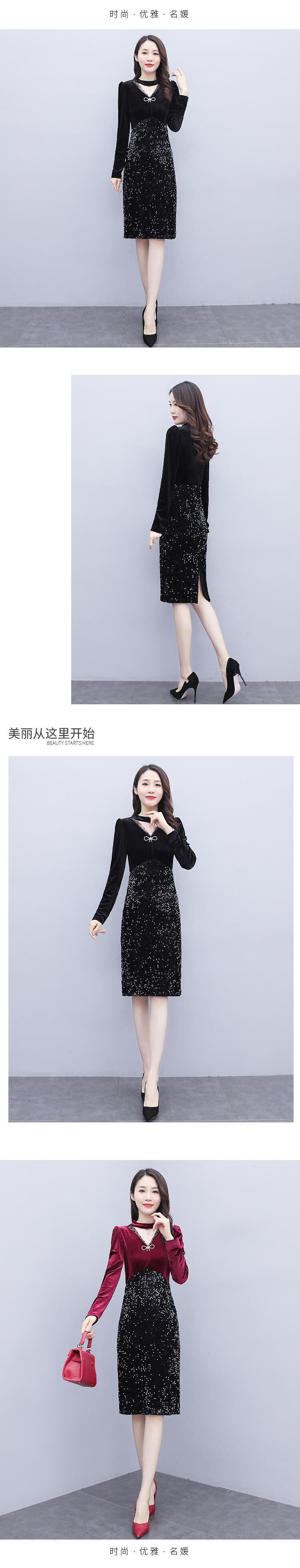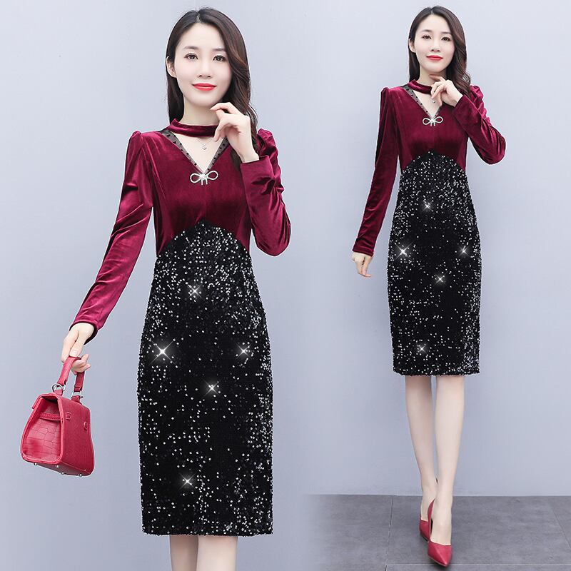 ゴールドベルベットドレス スプリングオータムスタンダードスリムVネックハイウェストウェストブラック レトロ 大きめサイズ 春物 秋物 muto37093736927