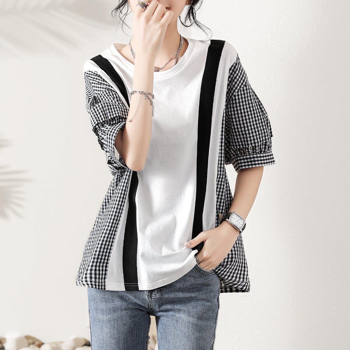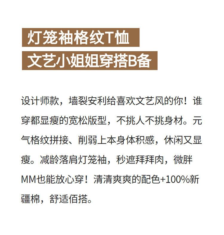 格子柄Tシャツ トップス サマースリーブセーター レディース ランタンスリーブ 大きめサイズ 夏物 ステッチ muto55851149129