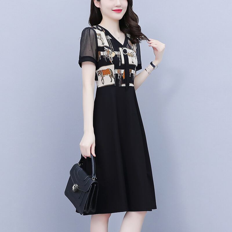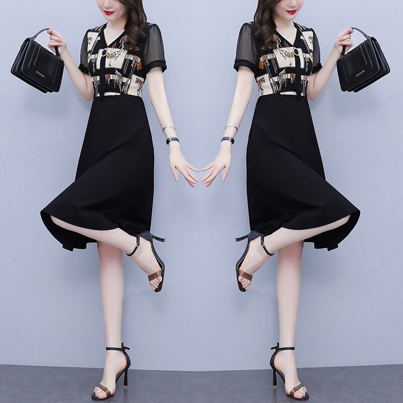 ドレス サマースタイルVネックウェストプリントAラインスカート 大きめサイズ 夏物 ステッチ muto14261161480