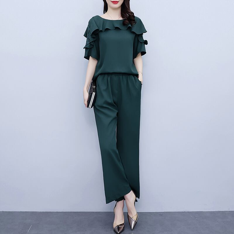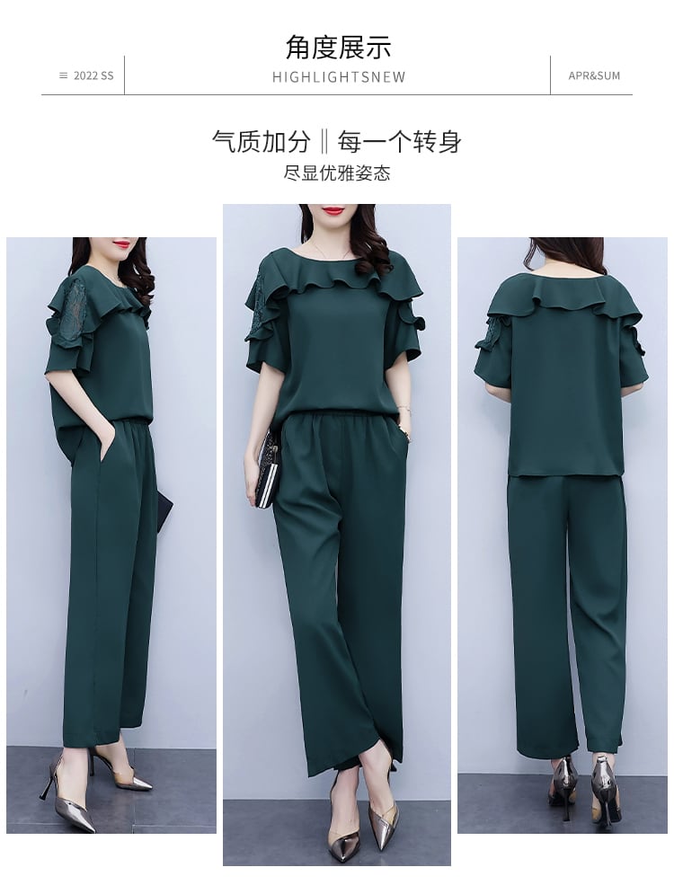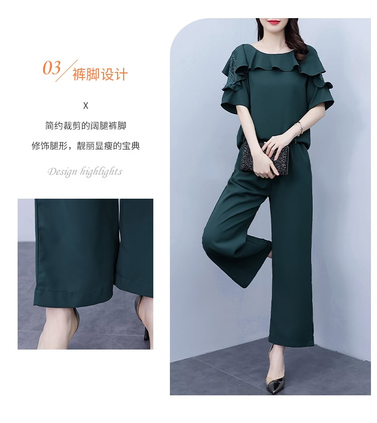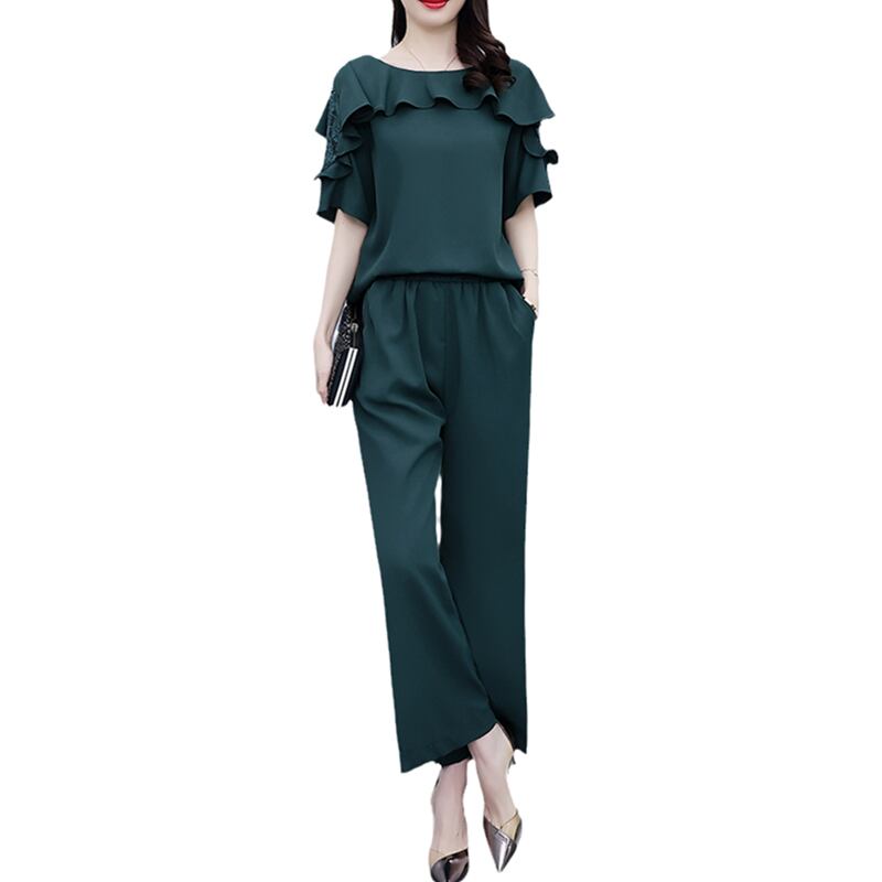シフォンサマーラウンドネックトップス ワイドレッグパンツ セット 大きめサイズ 夏物 Oネック ワイドパンツ muto39499933989
