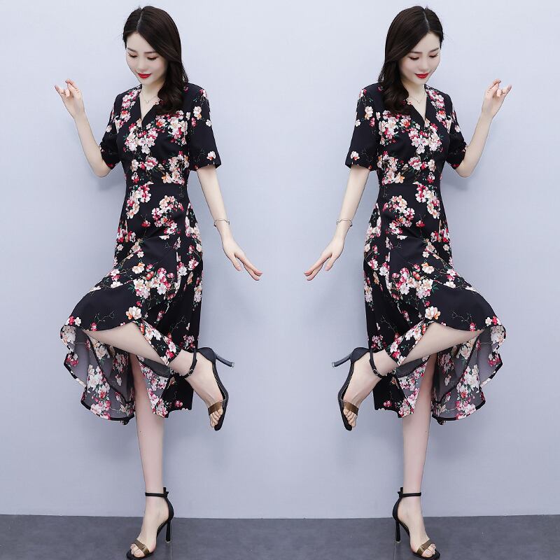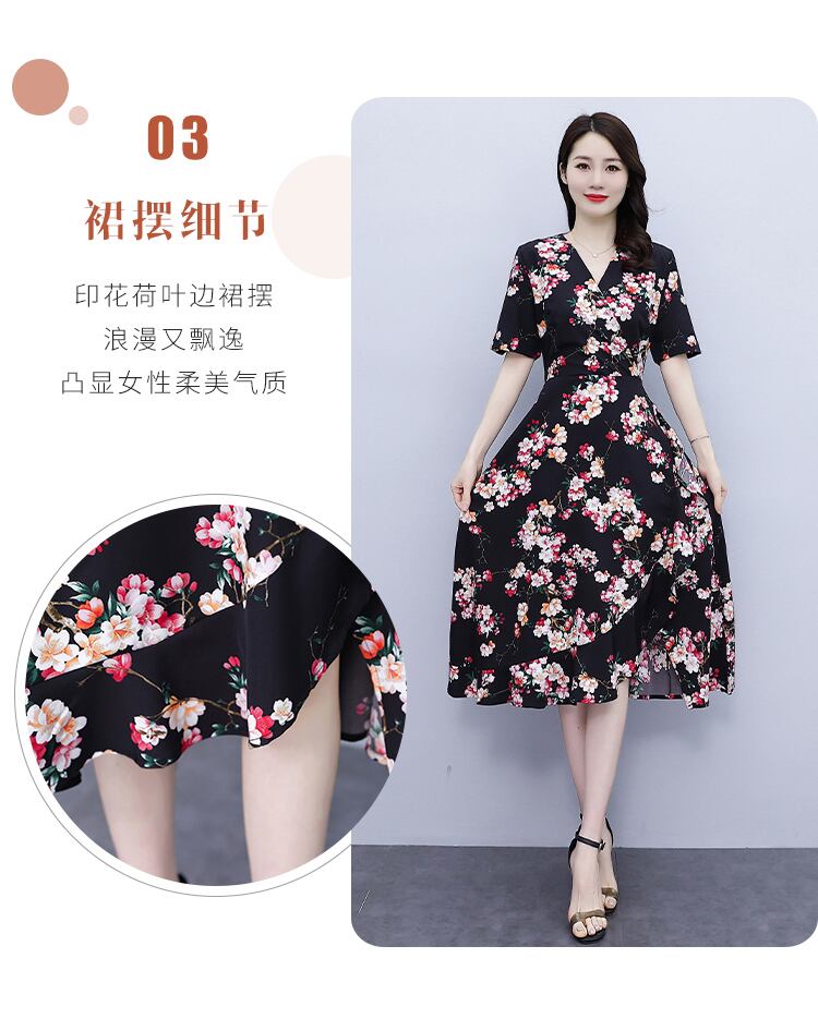 フローラルVネックドレス ウェストサマーラッフルスカート 大きめサイズ 夏物 花柄 muto93936787551