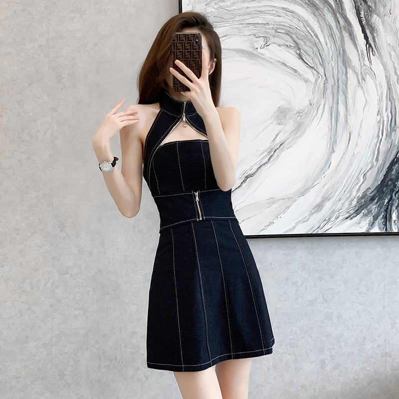 サマーホルタードレス ハイウェストウェストバックレスジッパースカート 大きめサイズ 夏物 muto48564888915