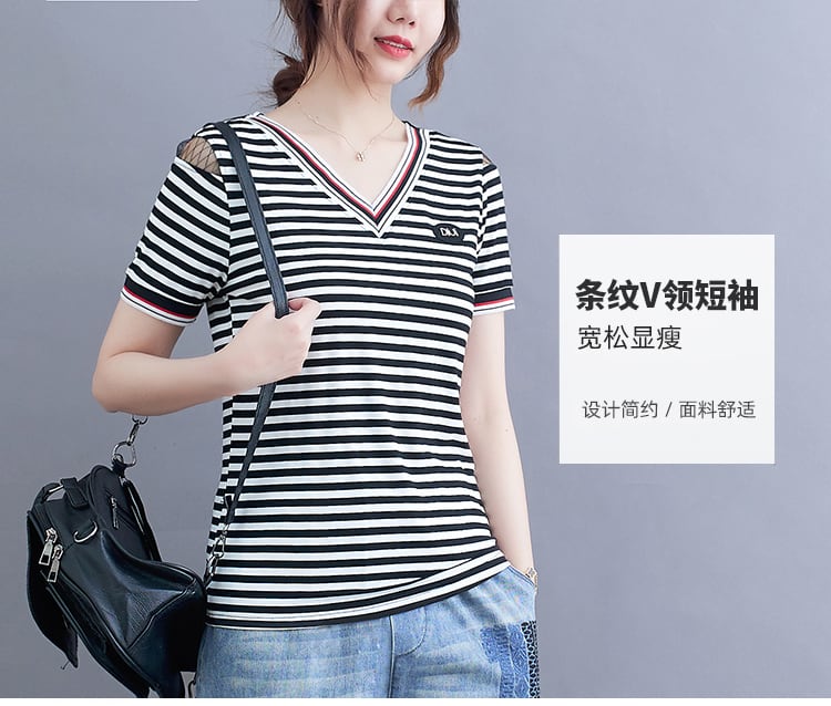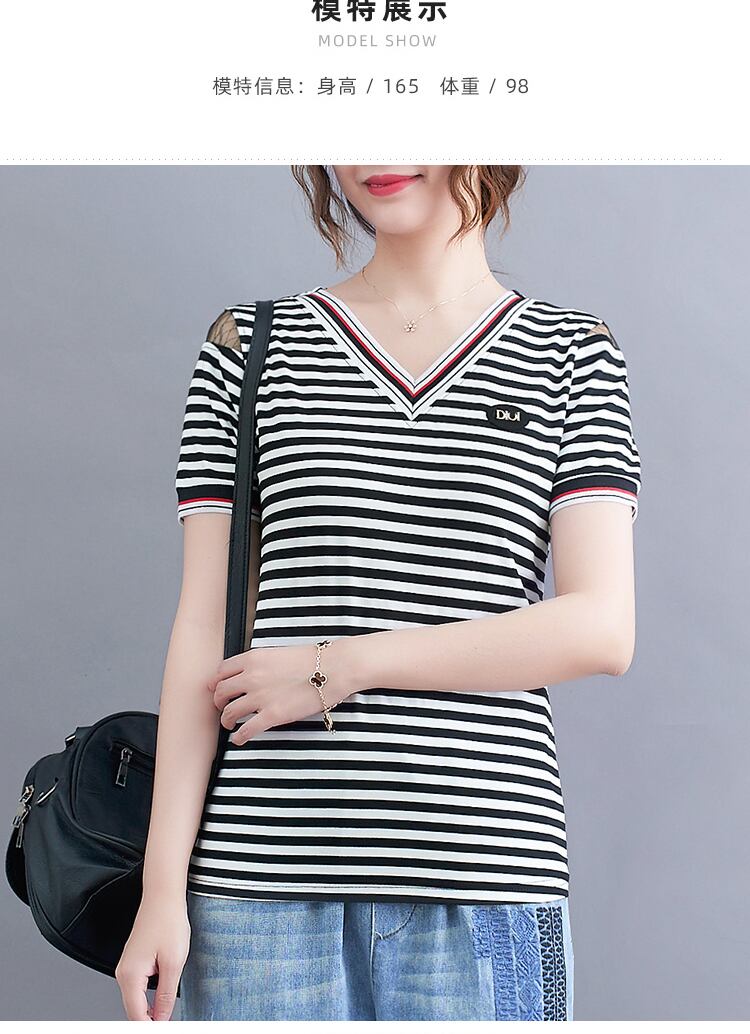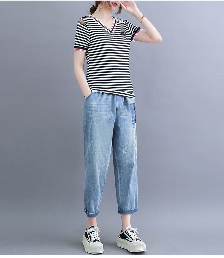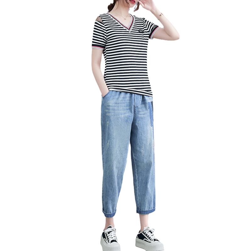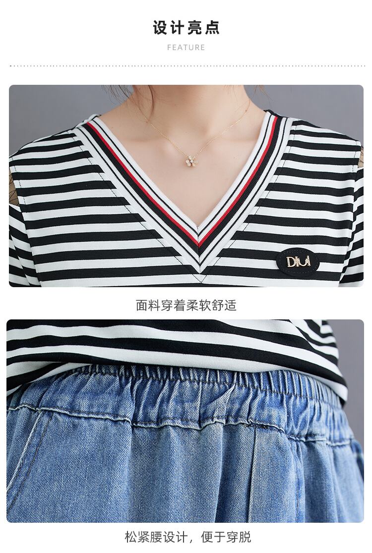 Tシャツ ストライプスリムジーンズ セット サマーVネック 大きめサイズ 夏物 muto15800028302