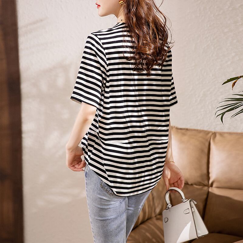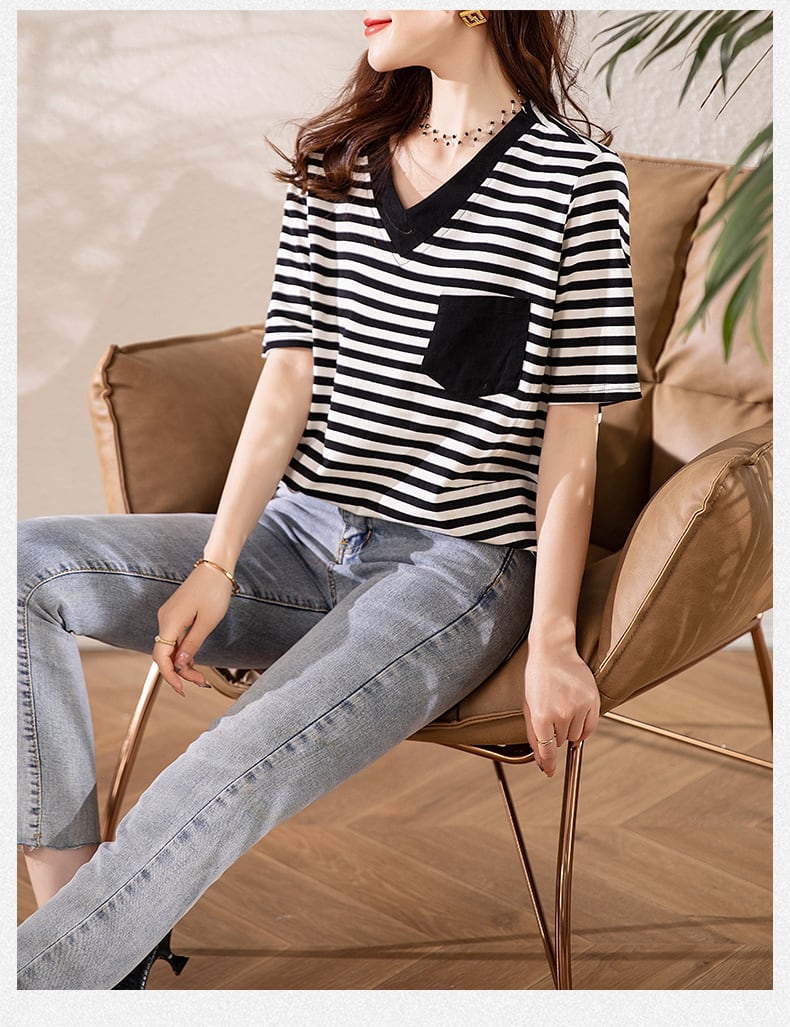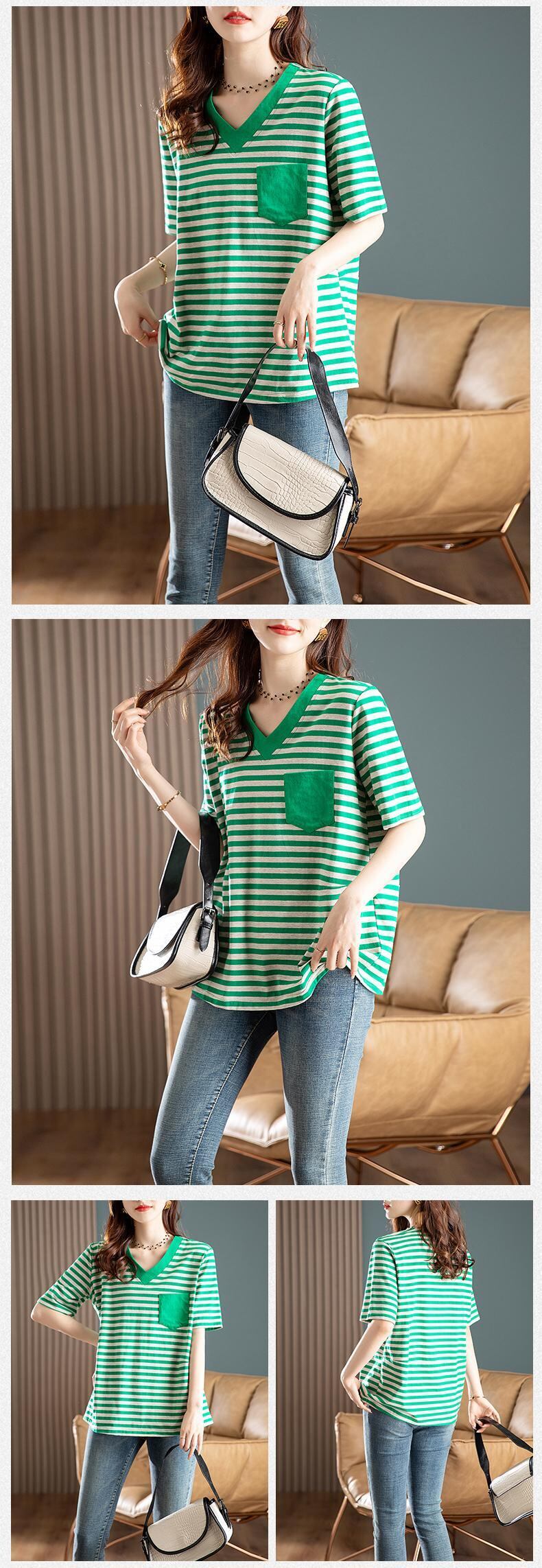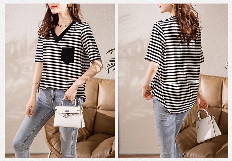 ルーズVネックトップス サマーストライプ薄手Tシャツ レディース 大きめサイズ 夏物 muto97787082348