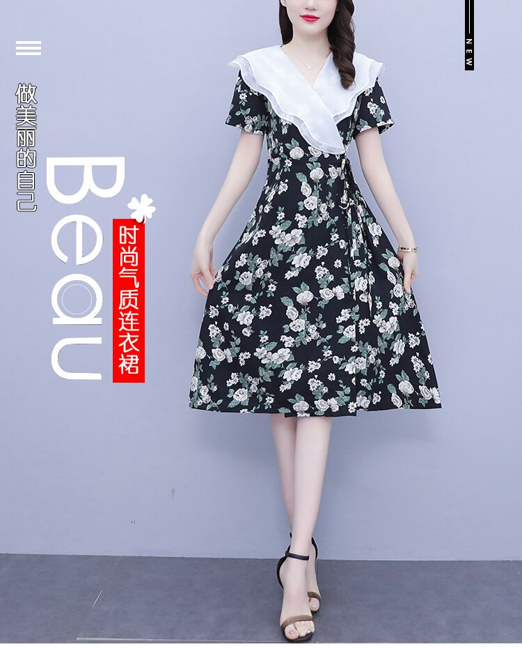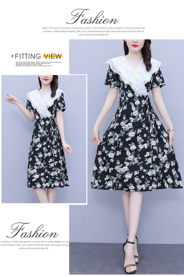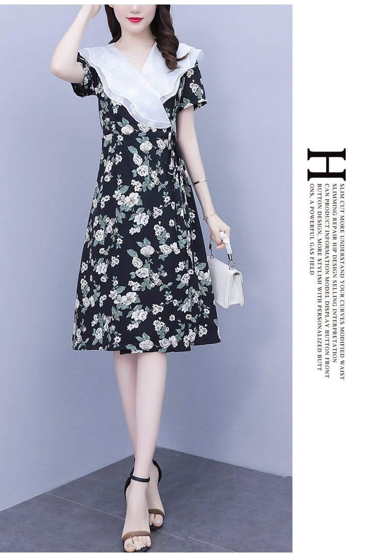 プリントスリムVネックドレス サマースタンダードスカート レトロ 大きめサイズ 夏物 muto67345432087