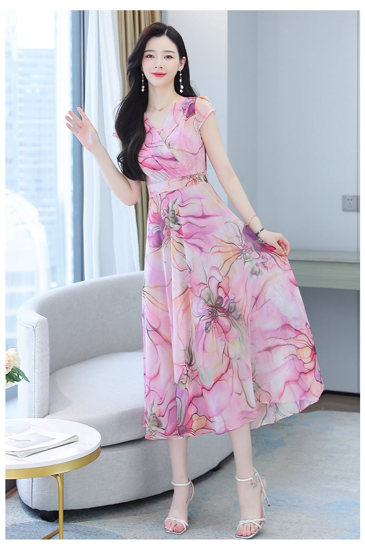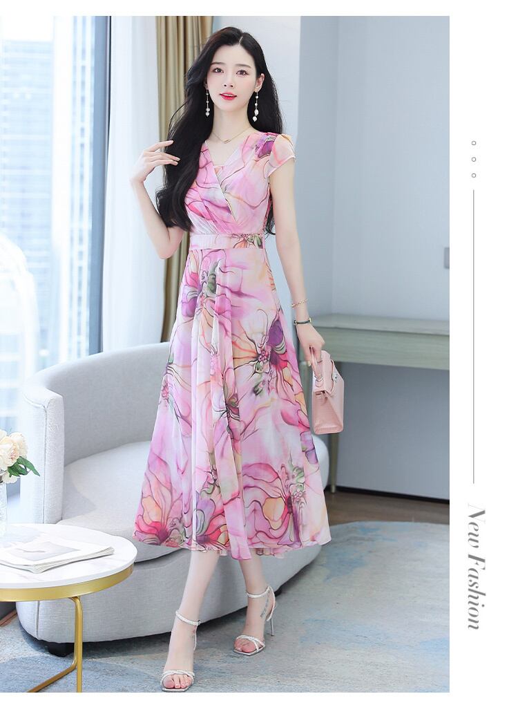 シフォンプリント柄ドレス サマースリムフィットウェストロングスカート 大きめサイズ 夏物 muto11995546460