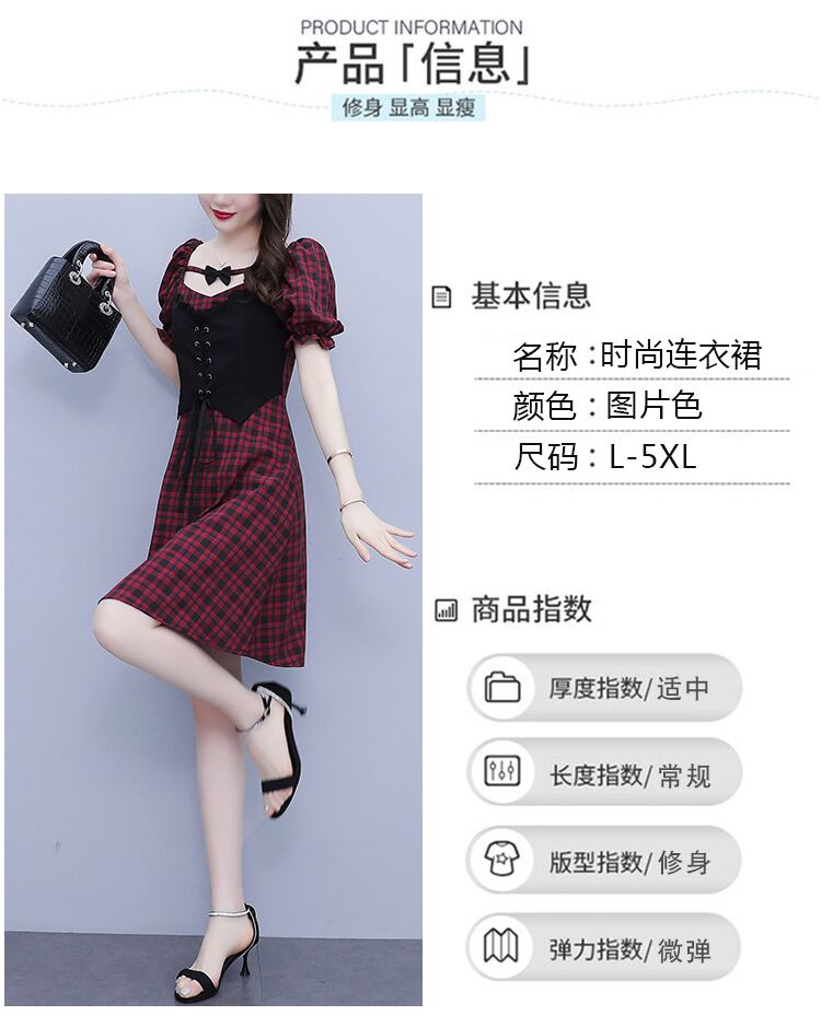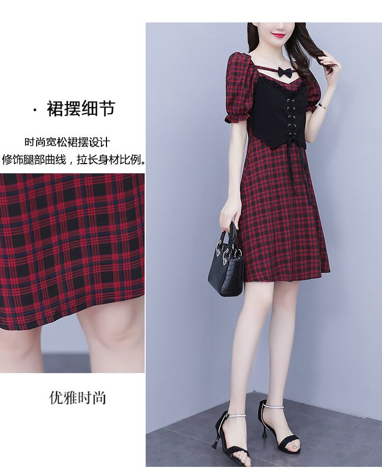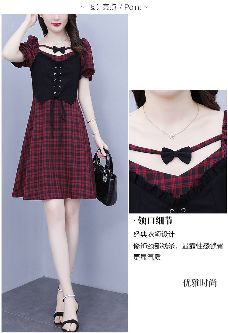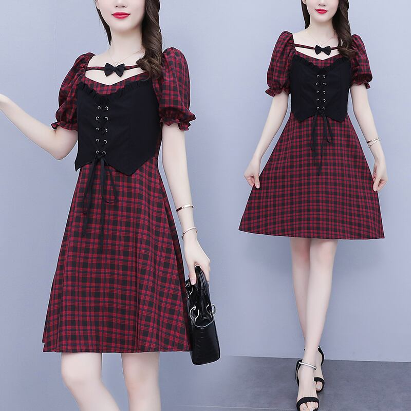 リボン格子柄スカート ハイウェストウェストサマースリムドレス 大きめサイズ 夏物 muto56298798663