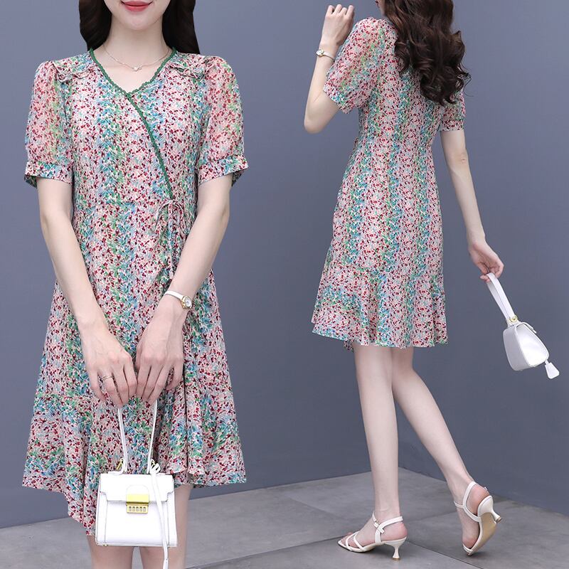 Vネックドレス サマーフローラルシフォンスカート 大きめサイズ 夏物 花柄 muto84420265