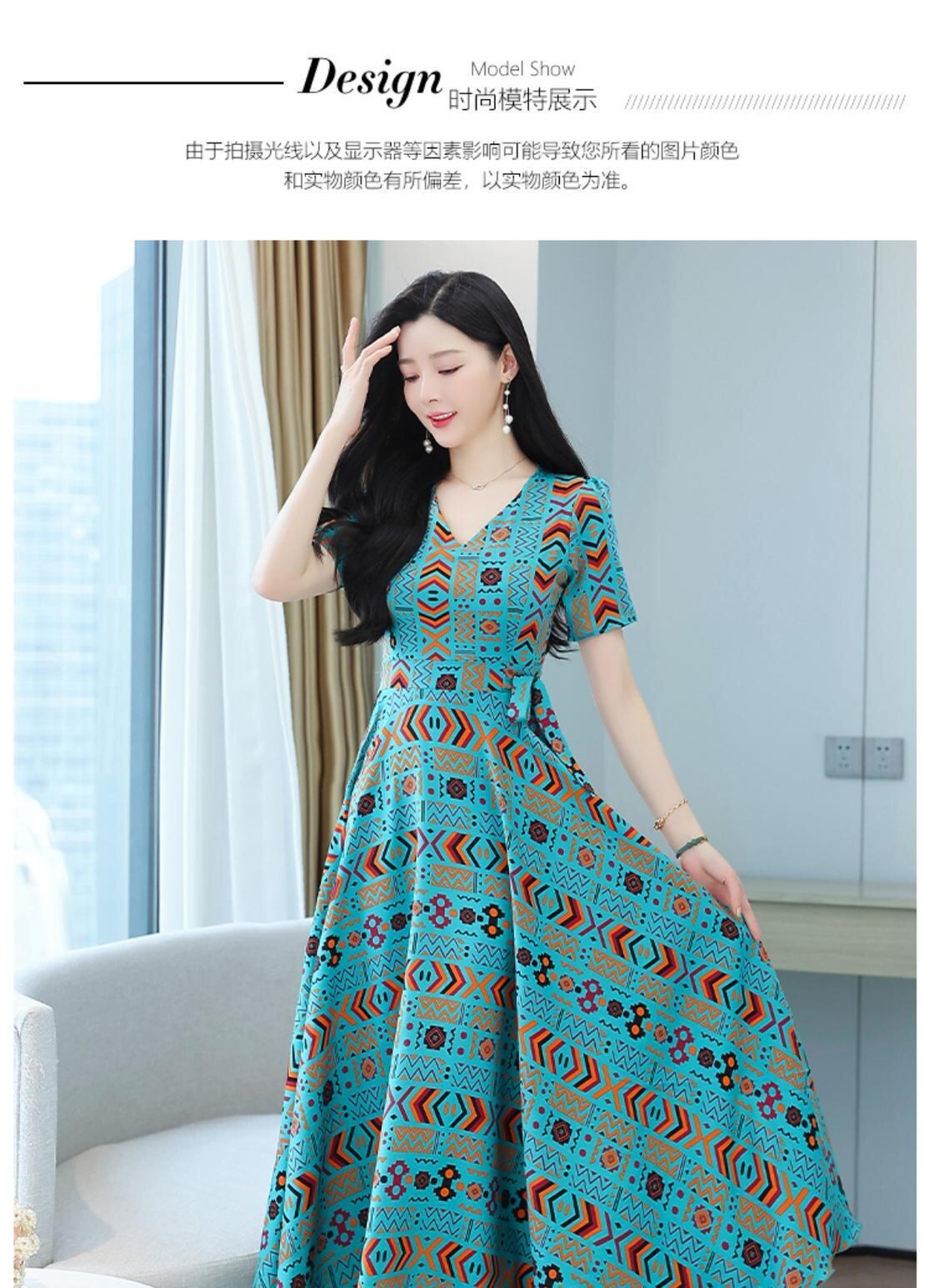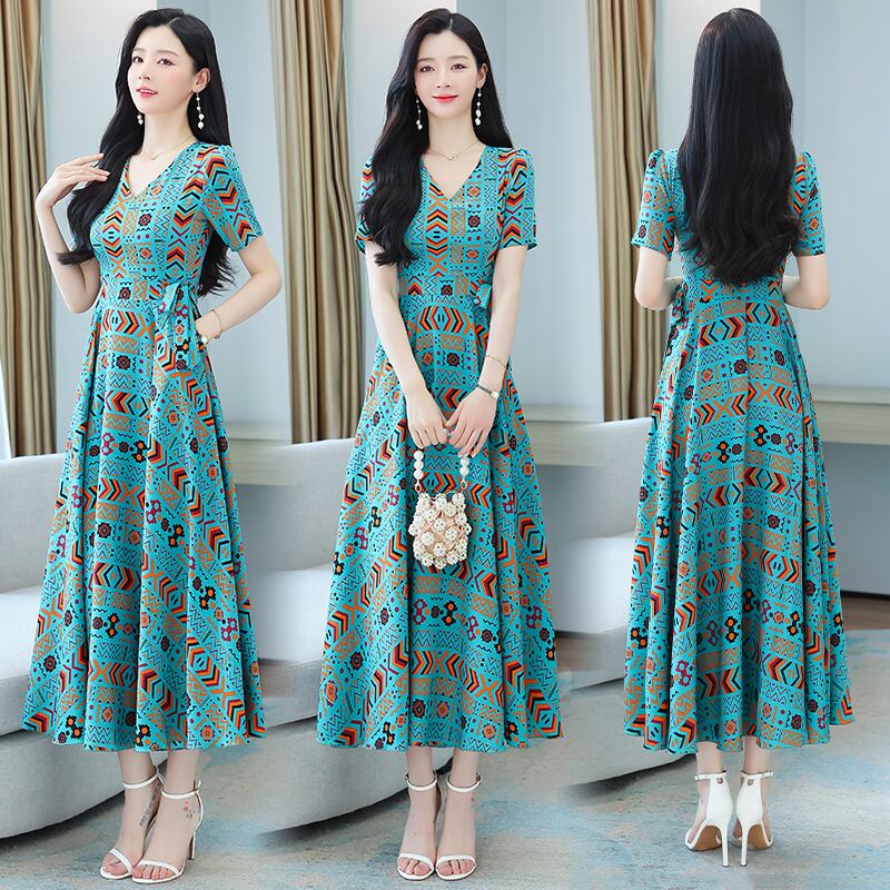 スリムVネックプリントスカート サマーカラードレス 大きめサイズ 夏物 muto62604652172