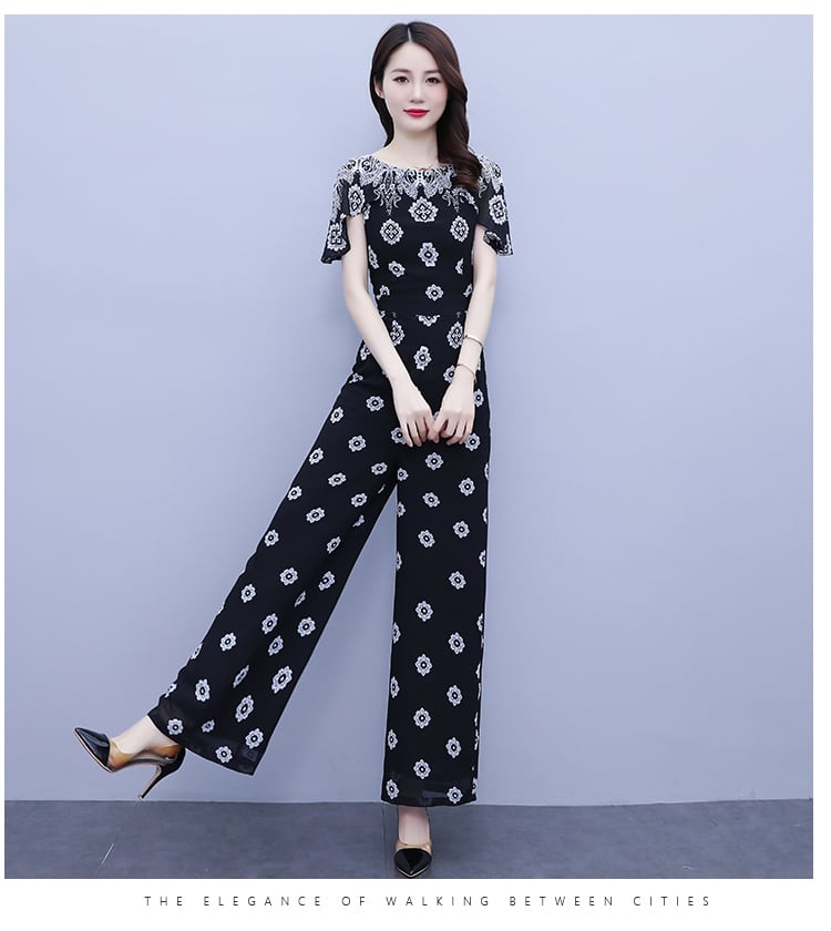ブラックフローラルシフォンジャンプスーツ オールインワン サマー薄手ロングワイドレッグパンツ レディース 大きめサイズ 夏物 花柄 ワイドパンツ muto99834266075