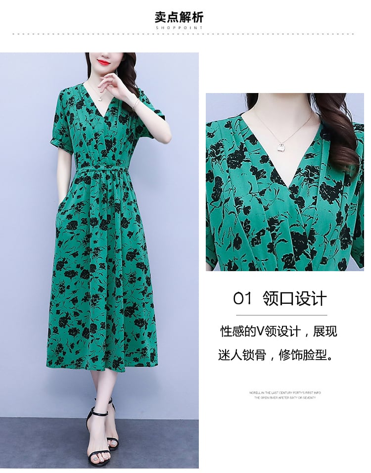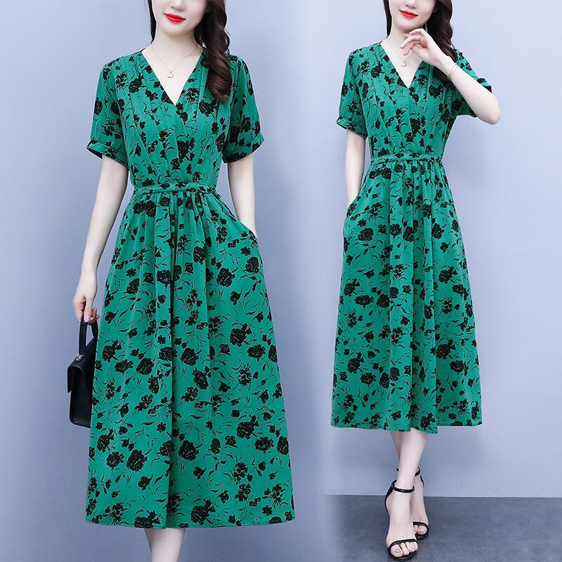 スタンダードVネックドレス サマースリムハイウェストシフォンロングAラインスカート レトロ レース 大きめサイズ 夏物 レースアップ muto41080970557
