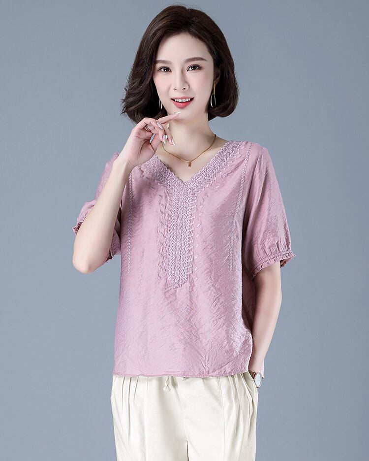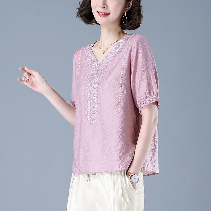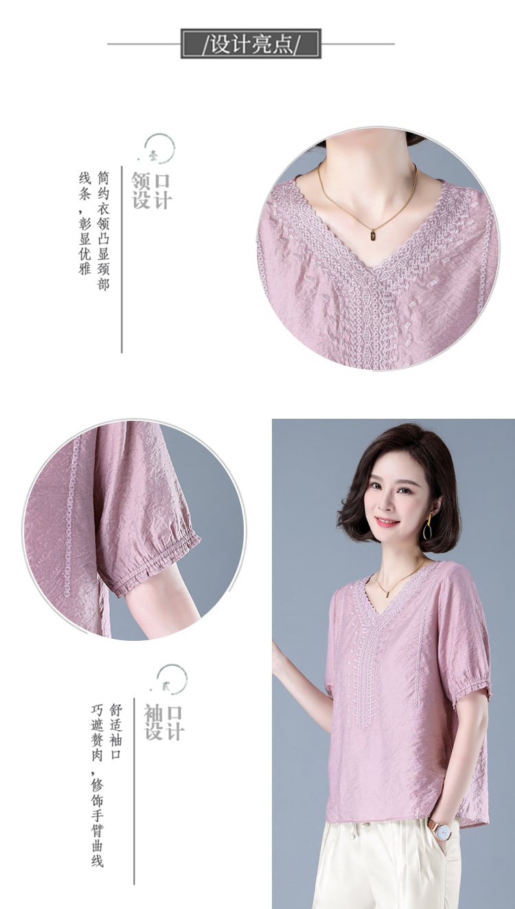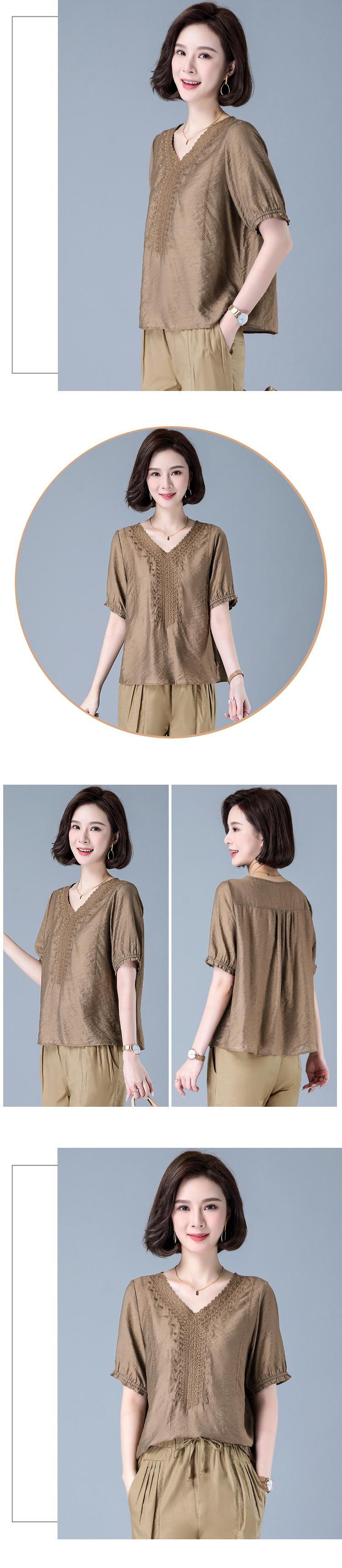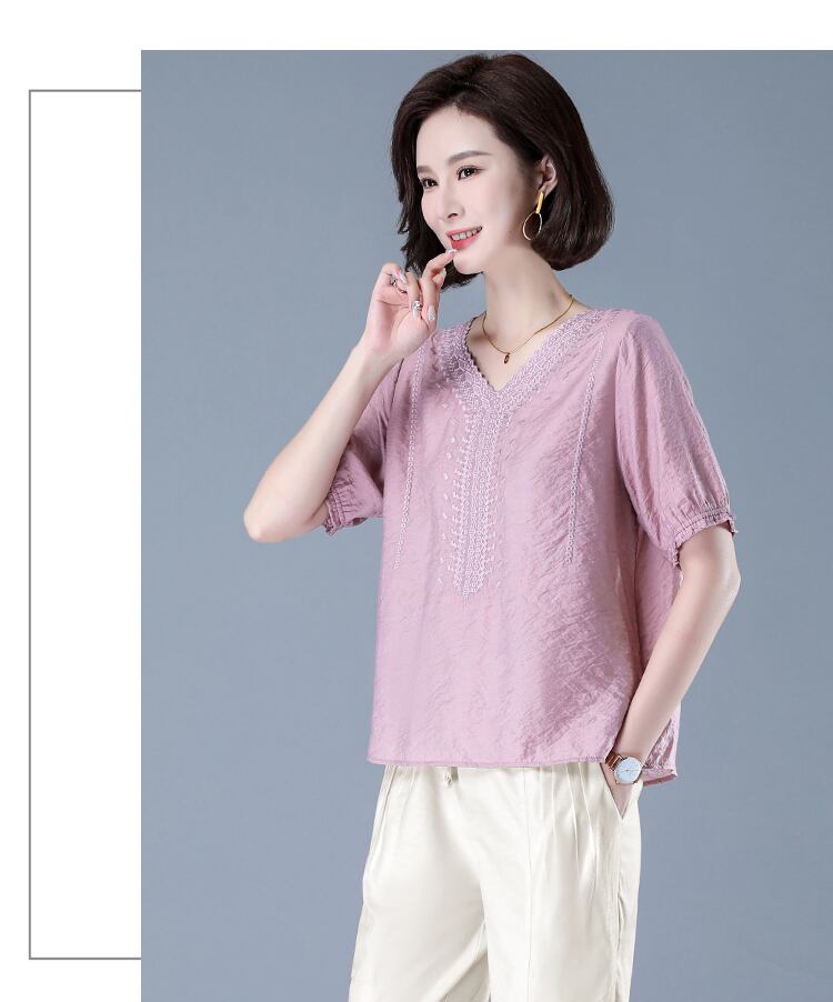 Tシャツ 薄手レースVネックトップス 大きめサイズ シルク ステッチ muto80425413008