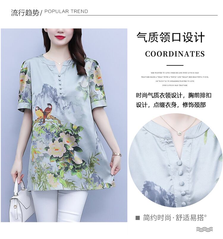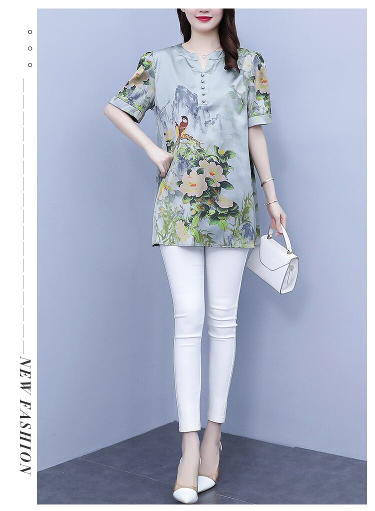 サテンプリントVネックシャツ トップス サマー 大きめサイズ 夏物 シルク muto19515280453