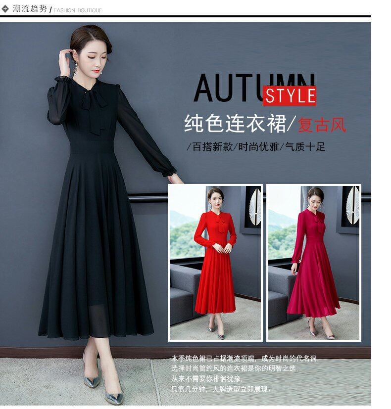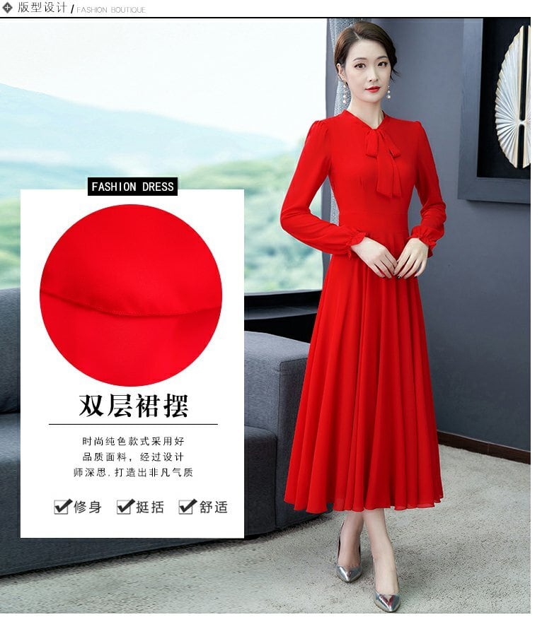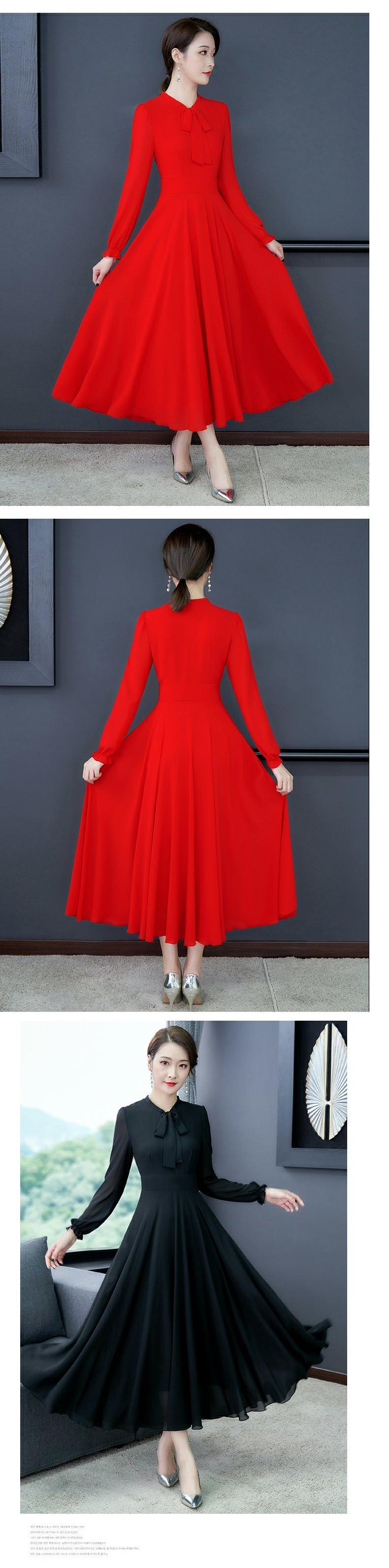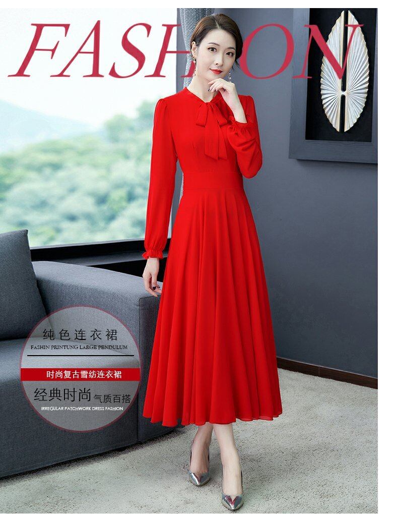 薄手スプリングオータムレッドドレス ウェストシフォンロングスカート 大きめサイズ 春物 秋物 muto94785735920
