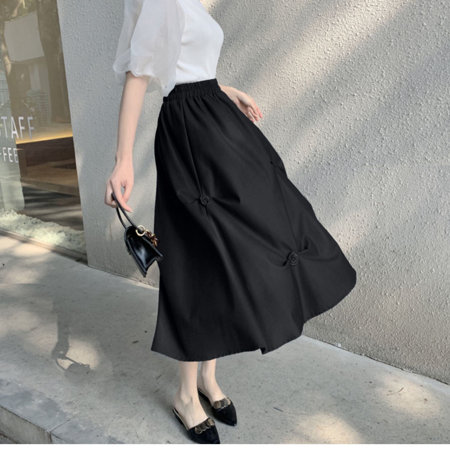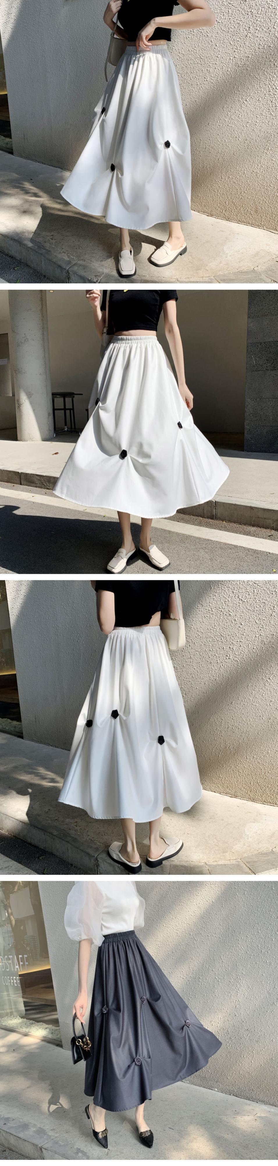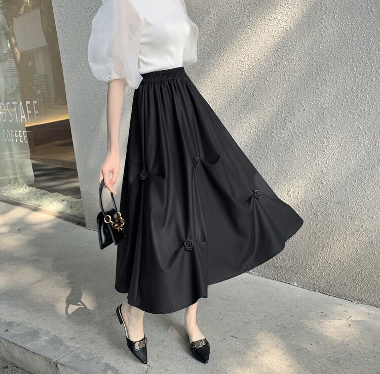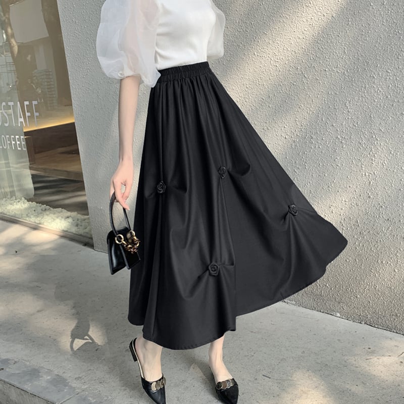 ストレッチウェストスカート サマープリーツFlowerデザイン Aラインロング エラスティック 伸縮 大きめサイズ 夏物 フラワーデザイン muto34356709365