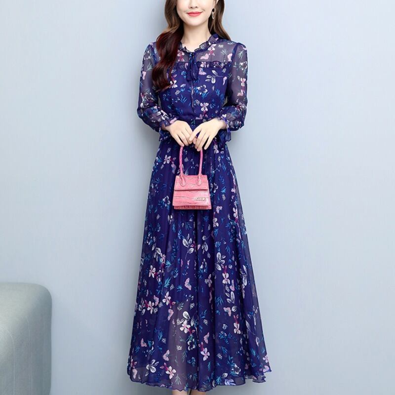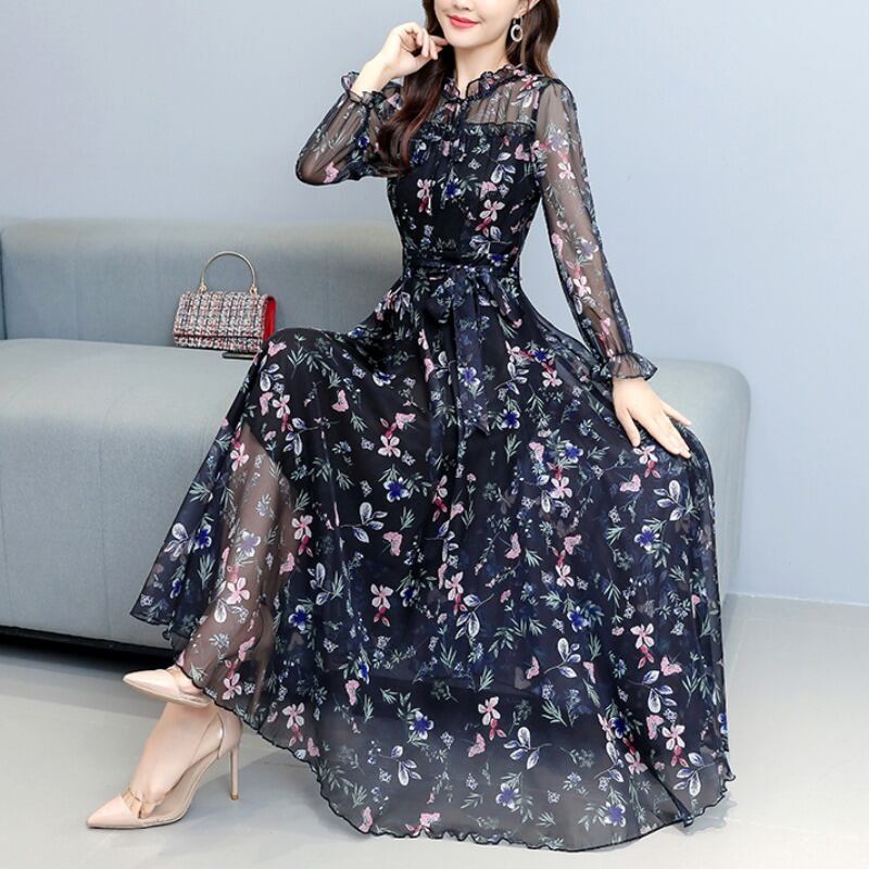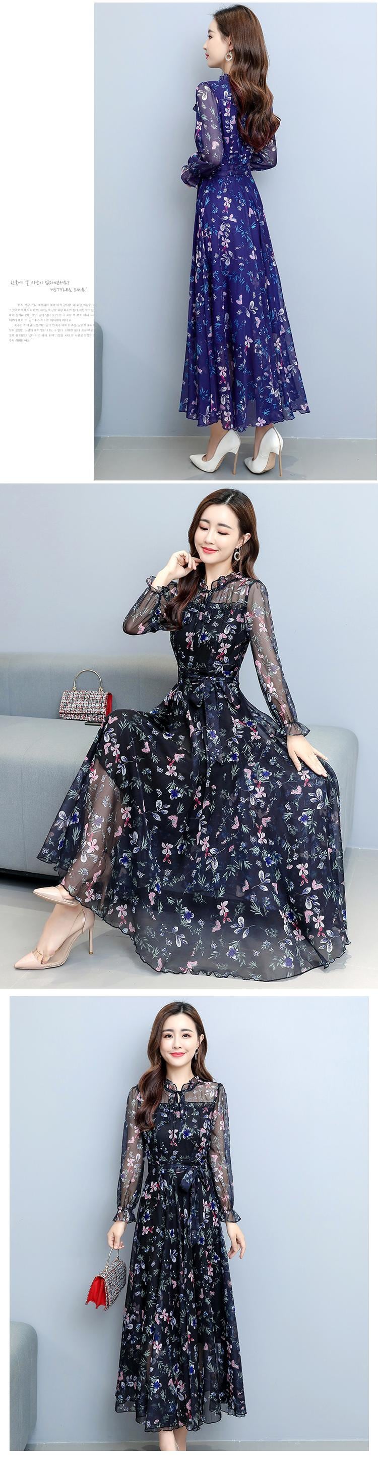 フローラルシフォンロングドレス オータムウェストスカート 大きめサイズ 秋物 花柄 muto47539883632