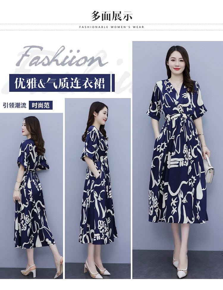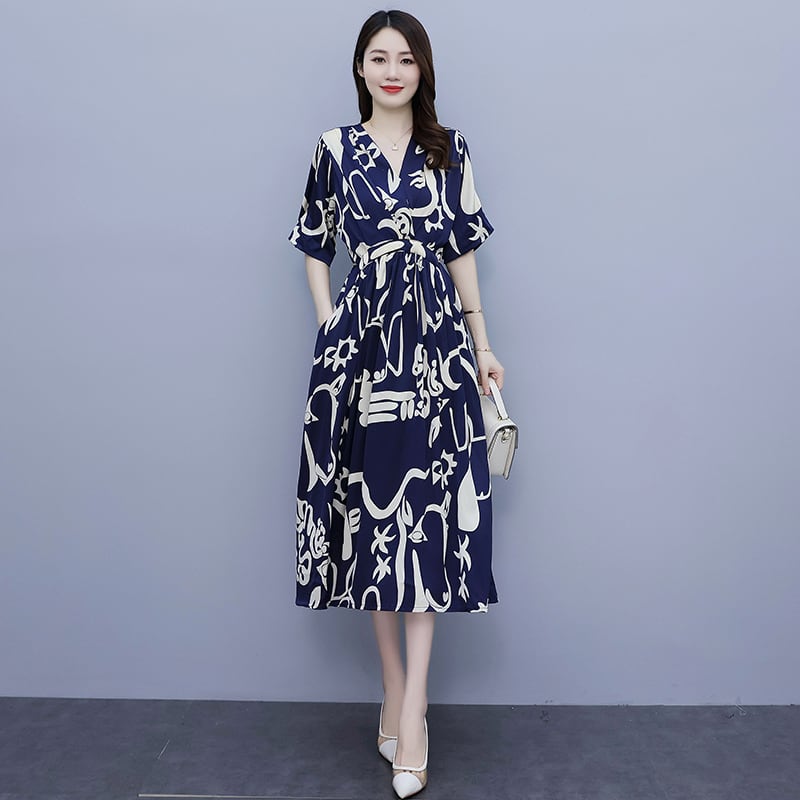 ブルーフローラルシフォンドレス サマーVネックウェストスリム 大きめサイズ 夏物 花柄 muto25367856408