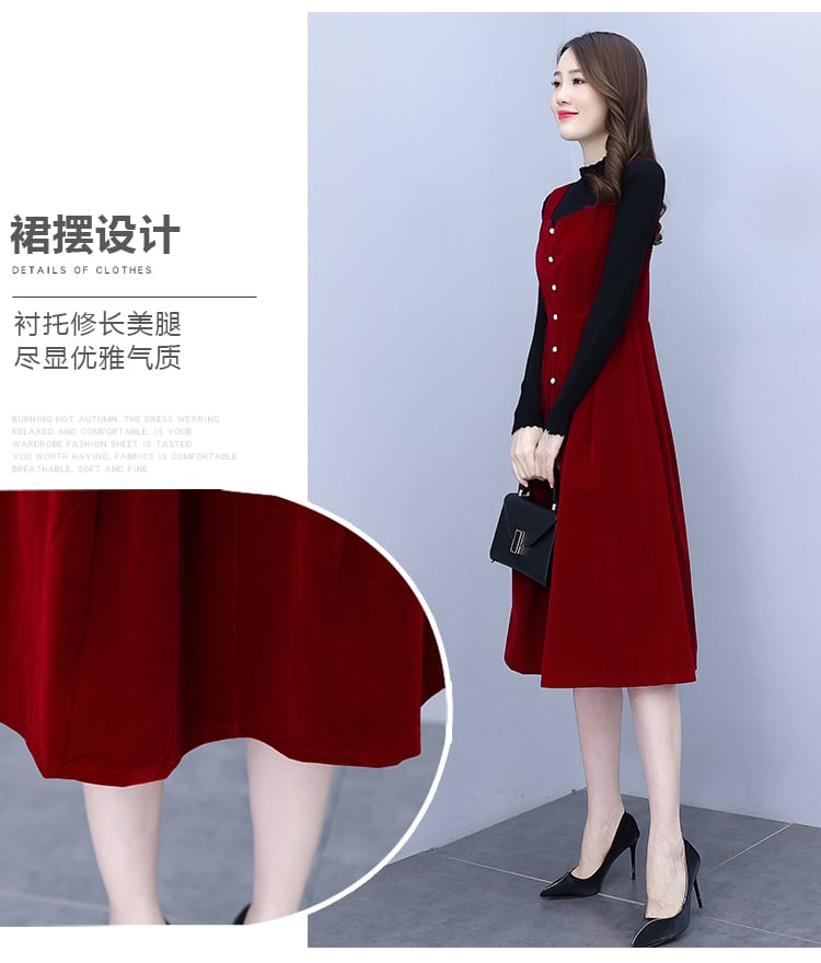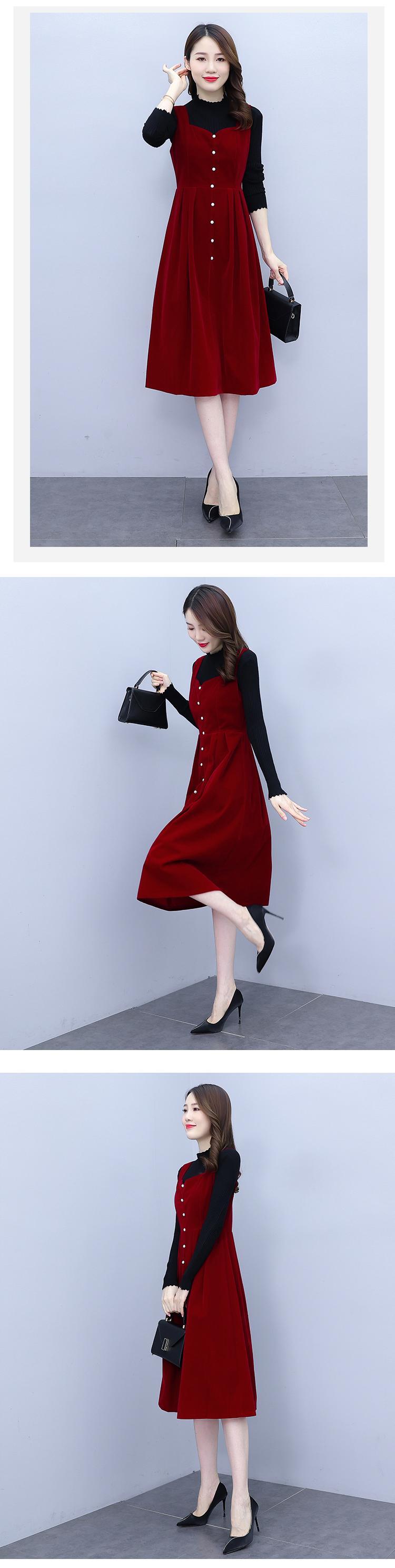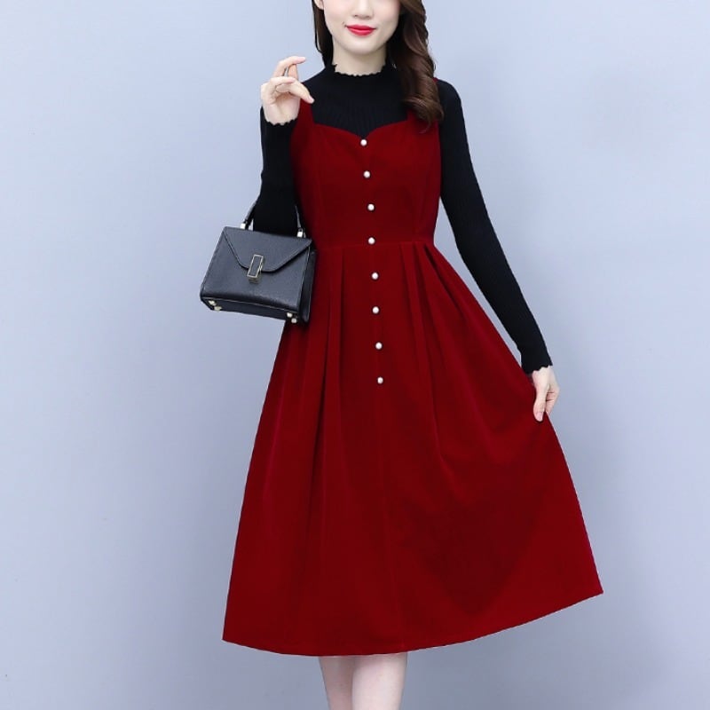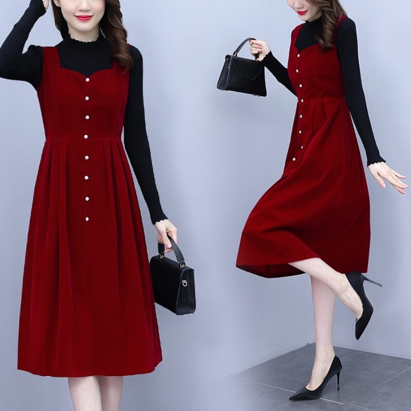 ゴールドベルベットドレス オータムウィンタースリムフィットレッドスカート 大きめサイズ 秋物 冬物 muto50302514248
