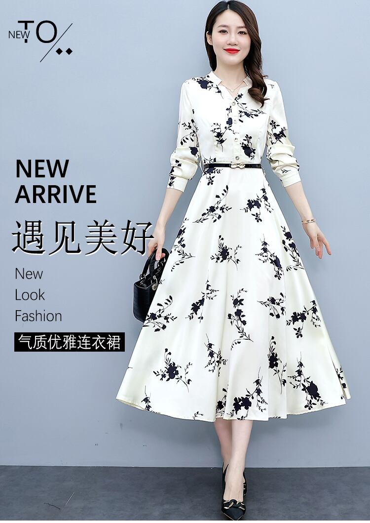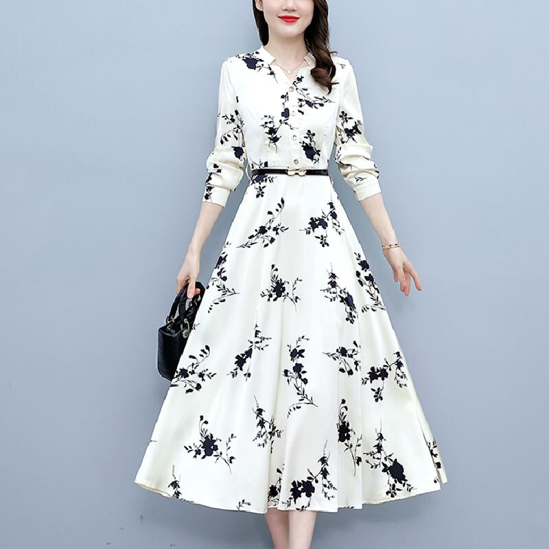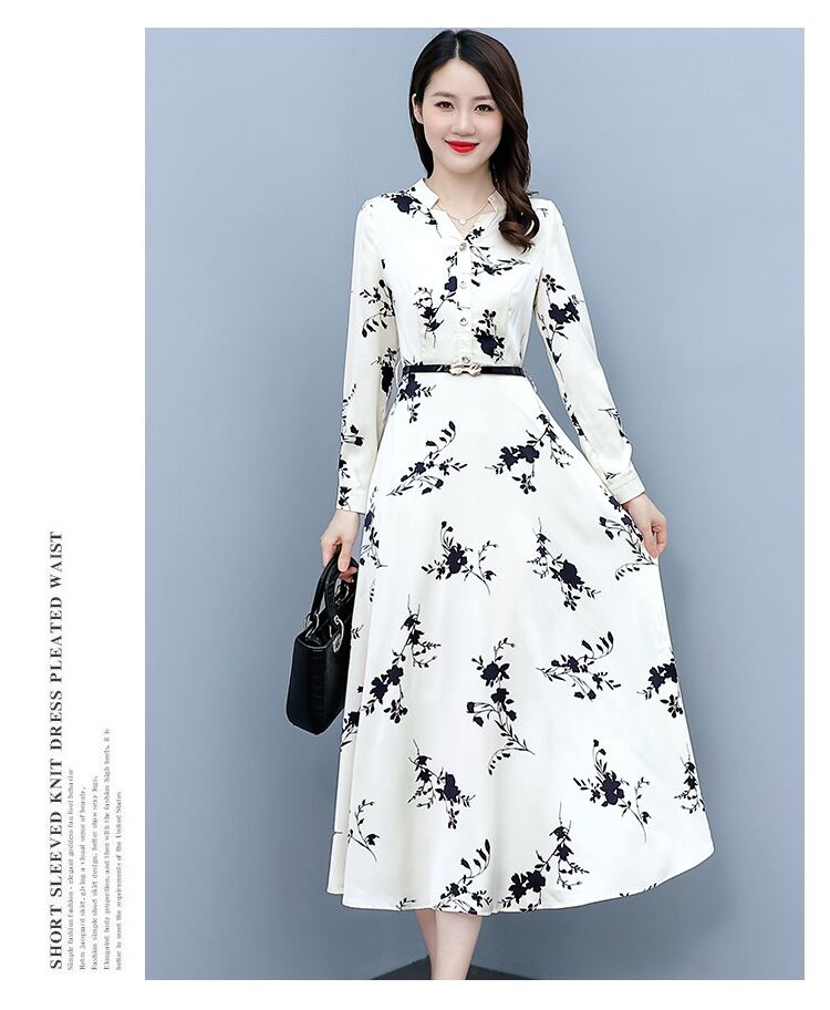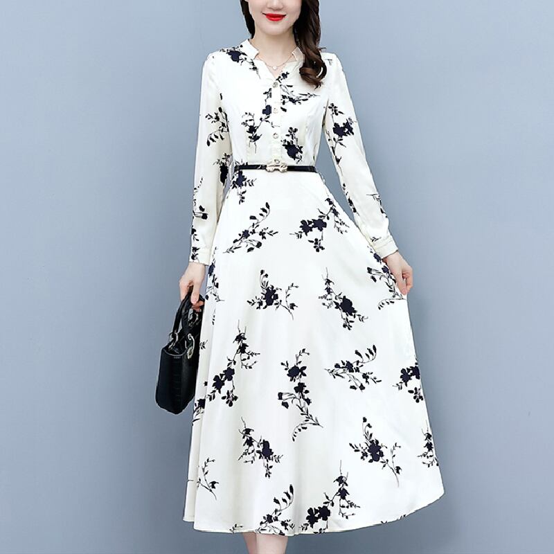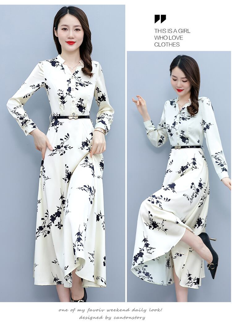 サテンプリント柄ドレス オータムスタイル薄手ロングスカート 大きめサイズ 秋物 muto74929308151
