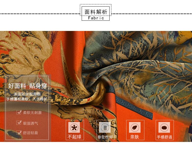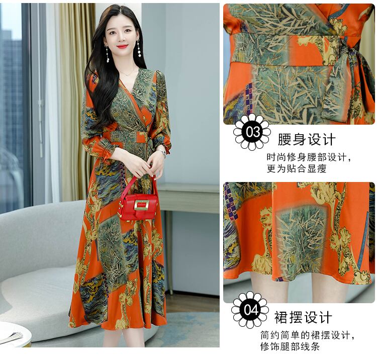 長袖スリーブプリントサテンドレス ウェスト薄手スカート ロング 大きめサイズ muto54373952556