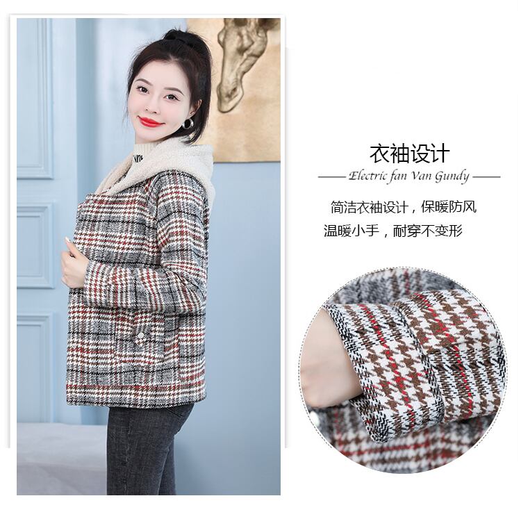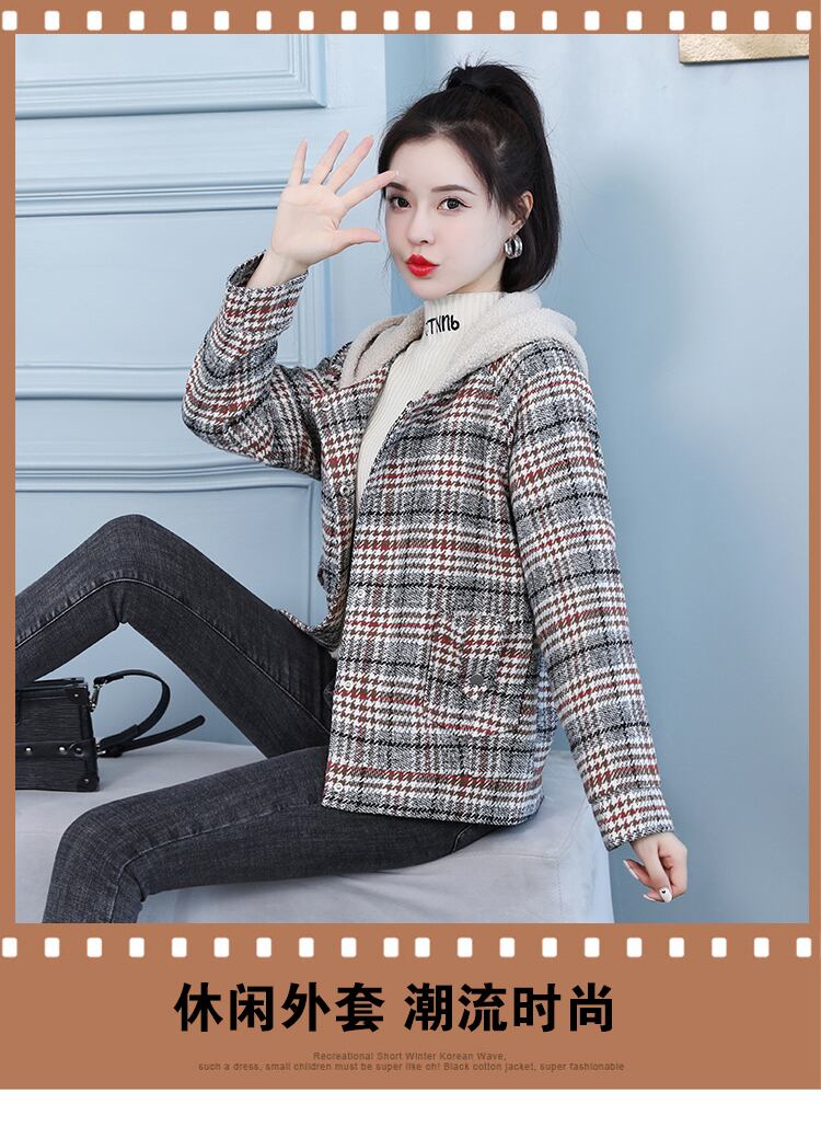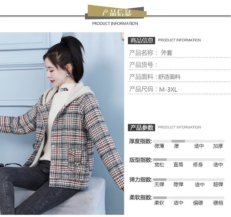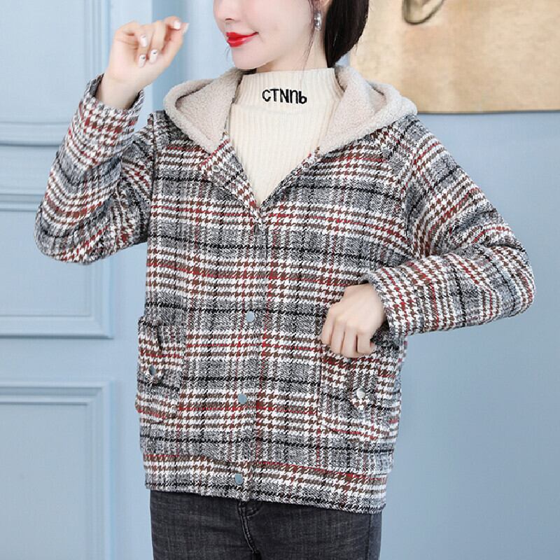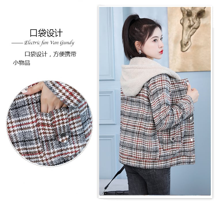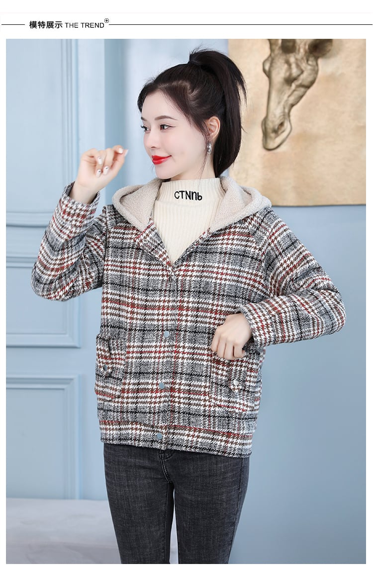 ベルベットフード格子柄ジャケット ウィンターショートトップス 大きめサイズ 冬物 muto59886528426