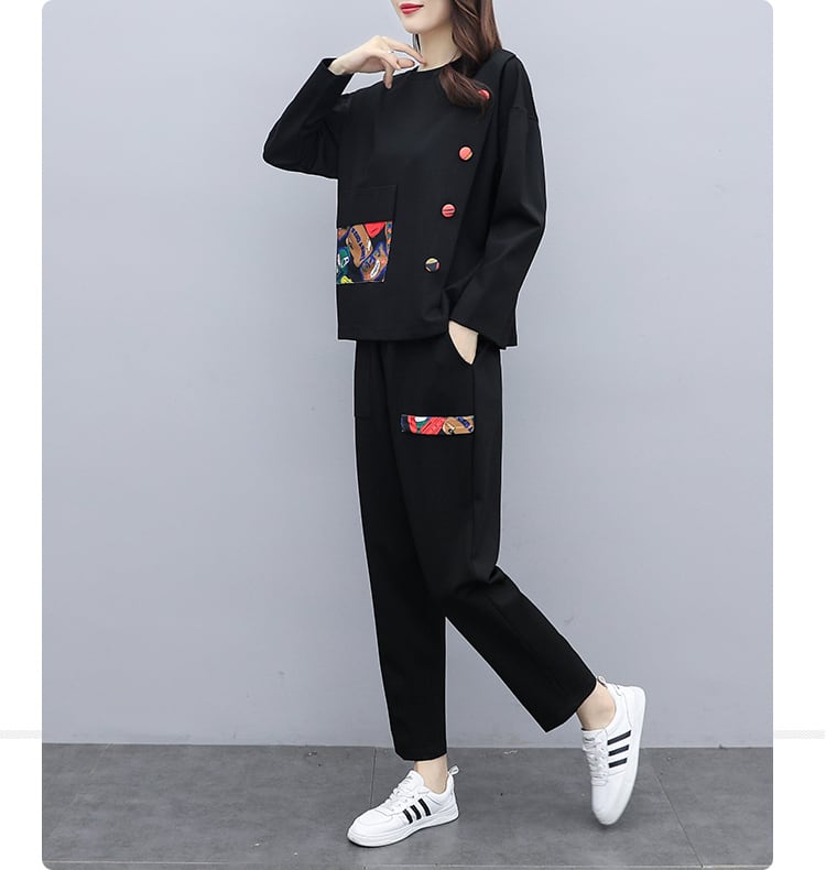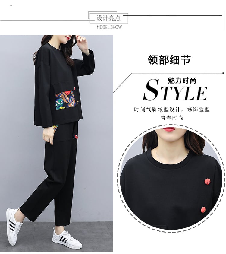 オータムルーズプリントラウンドネック長袖スリーブ ロング 大きめサイズ 秋物 Oネック ステッチ muto64640378994