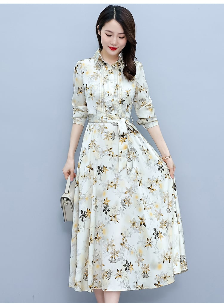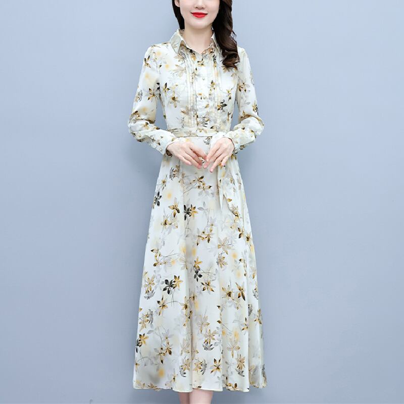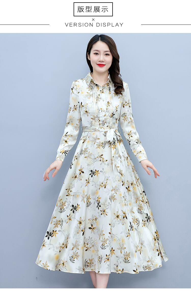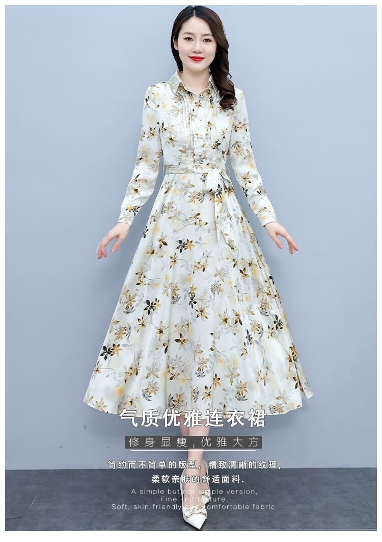 サテンプリント柄ドレス オータム薄手スカート ロング 大きめサイズ 秋物 muto63103547103