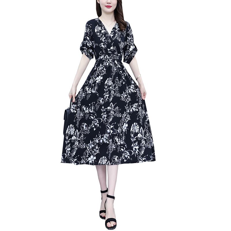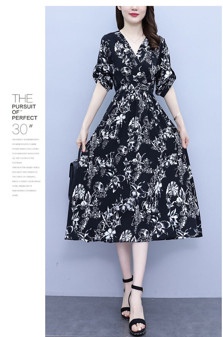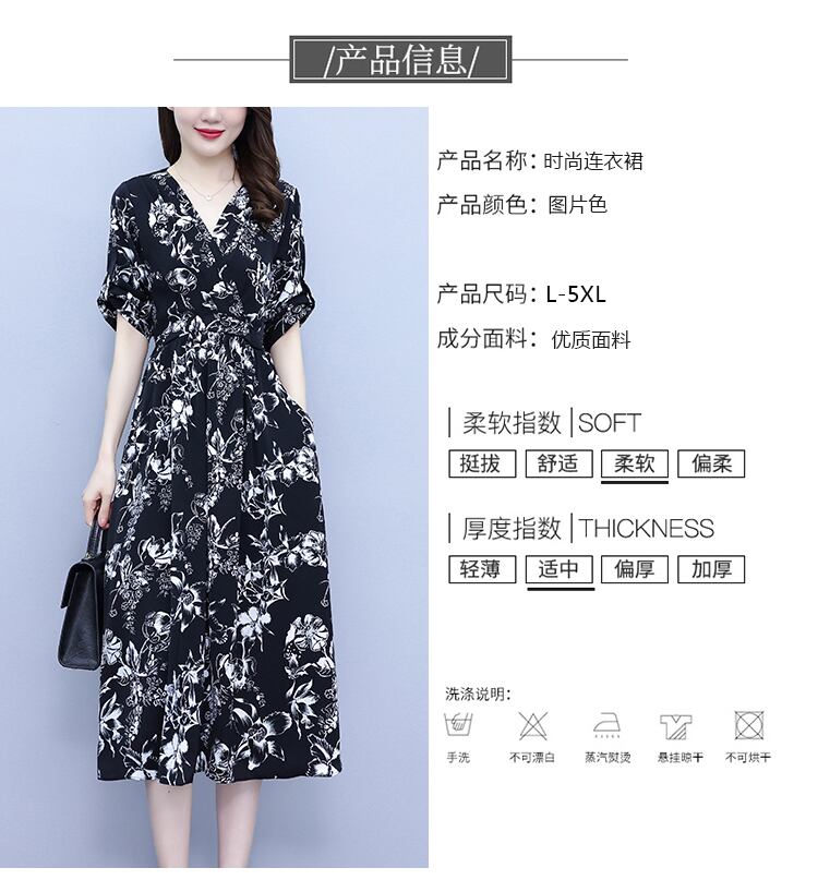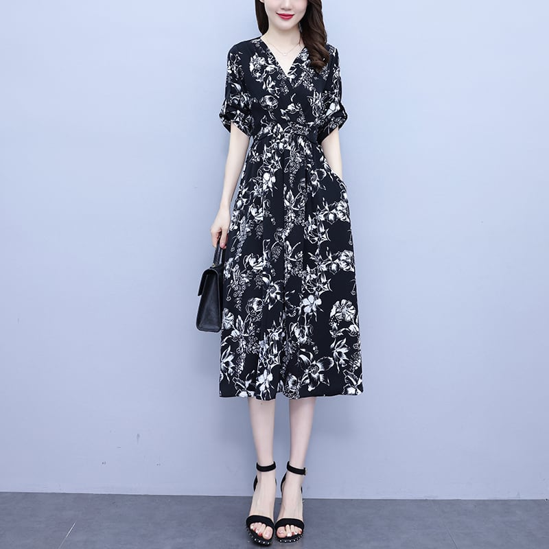 ロングプリントVネックドレス サマーウェストスリムスカート 大きめサイズ 夏物 muto7670357171