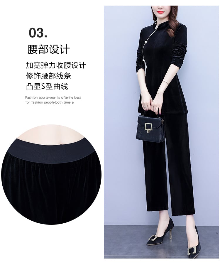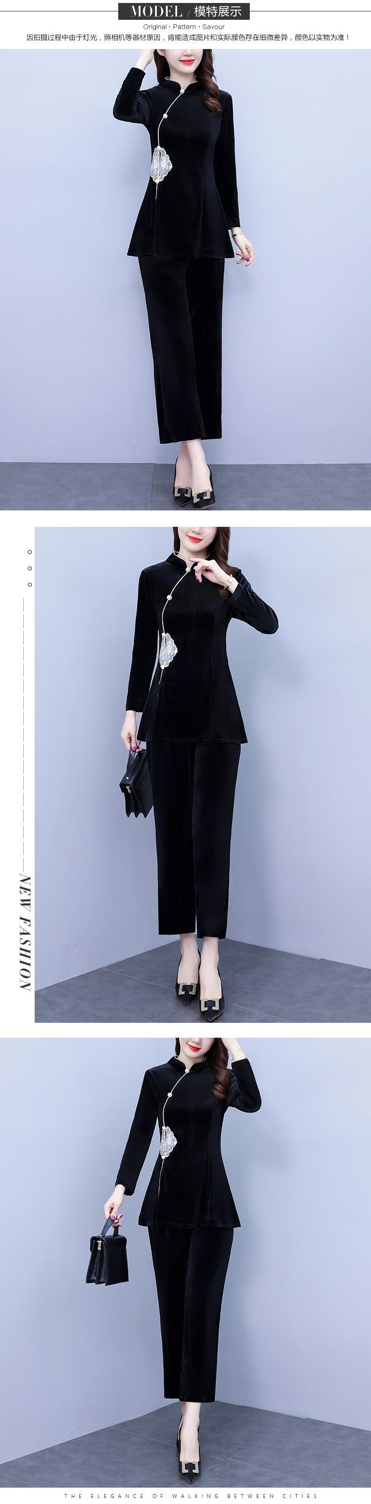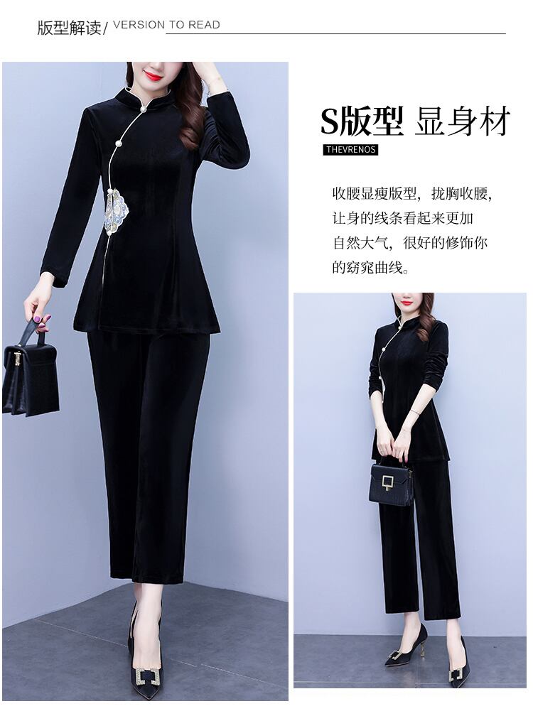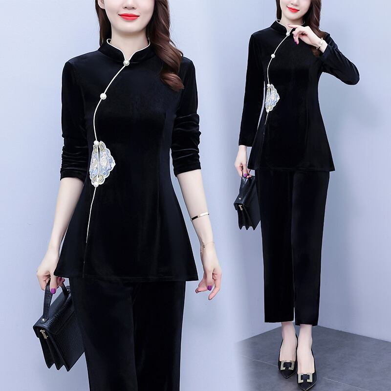 スタンダードゴールドベルベットオータムパールボタンパンツ セット レッド レトロ 刺繍 大きめサイズ 秋物 真珠 muto54852957866