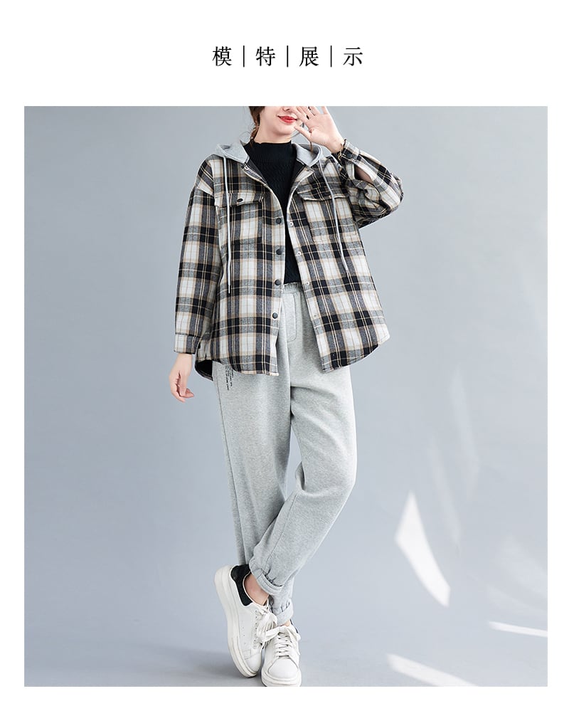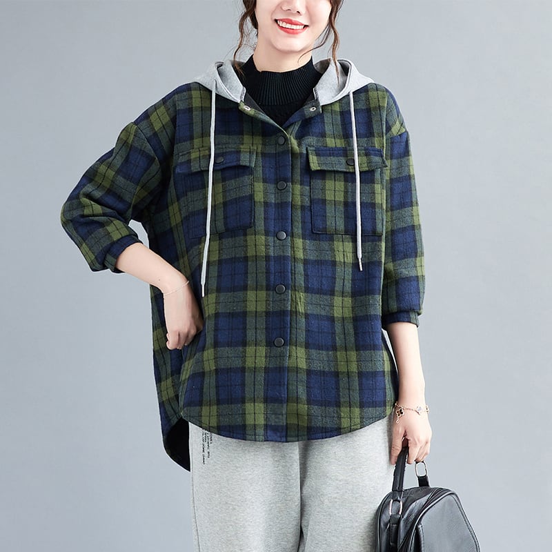 格子柄フードジャケット オータムウィンターベルベットルーズカジュアルトップス 大きめサイズ 秋物 冬物 ステッチ muto69780491876