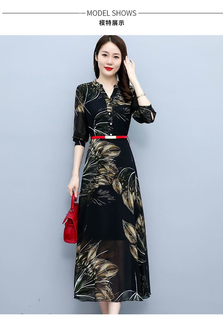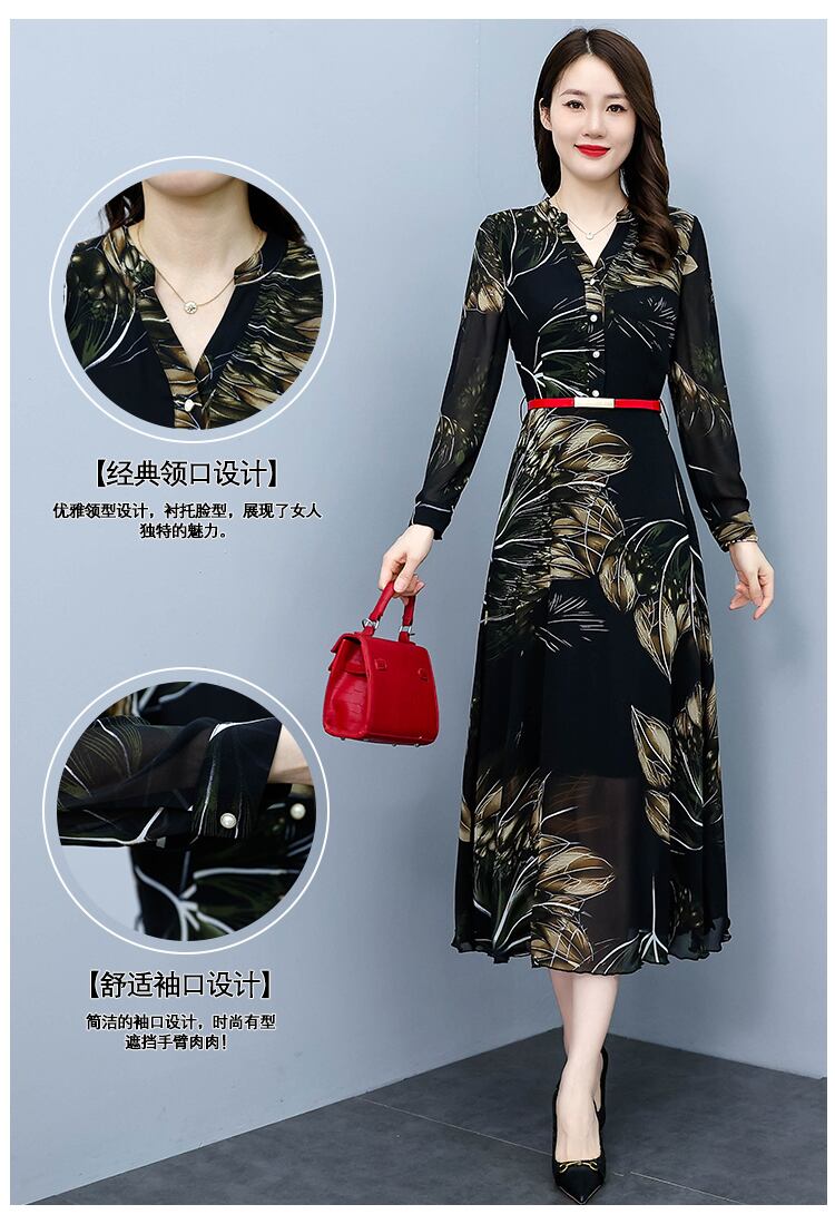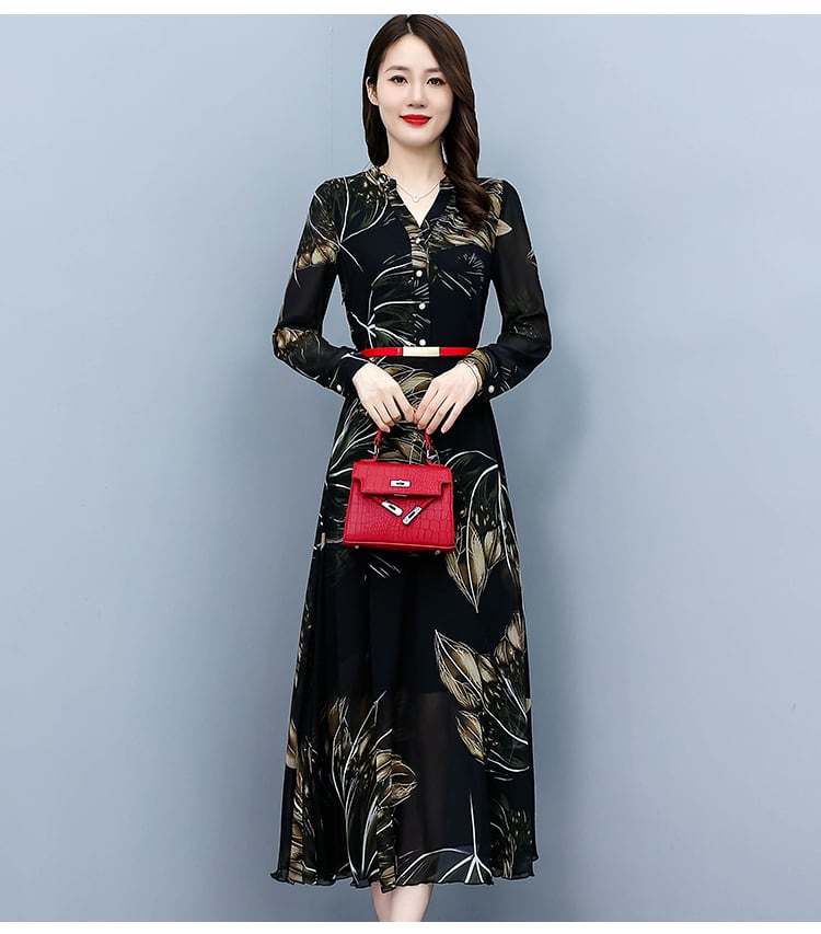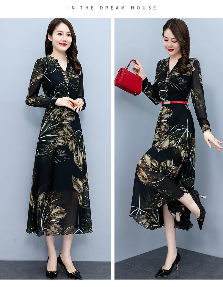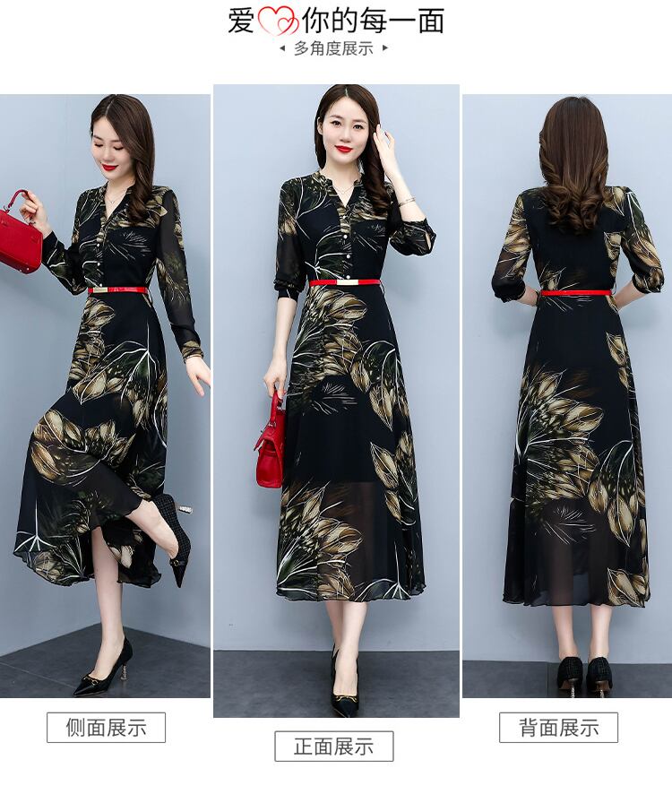 シフォンプリント柄ドレス オータムウェストスカート ロング 大きめサイズ 秋物 muto56057754482