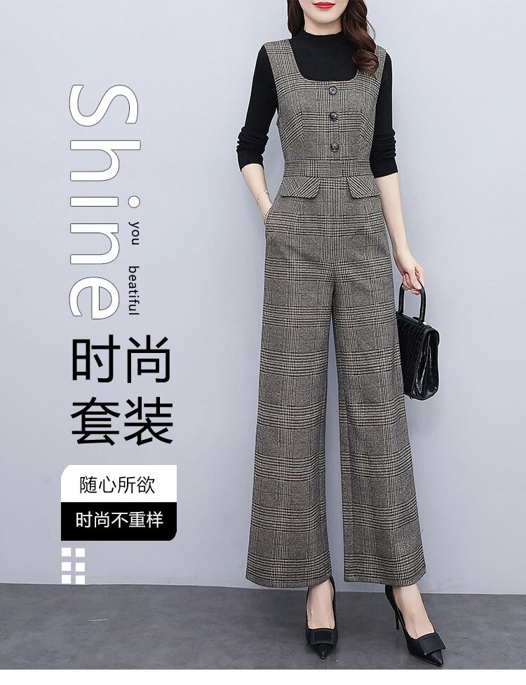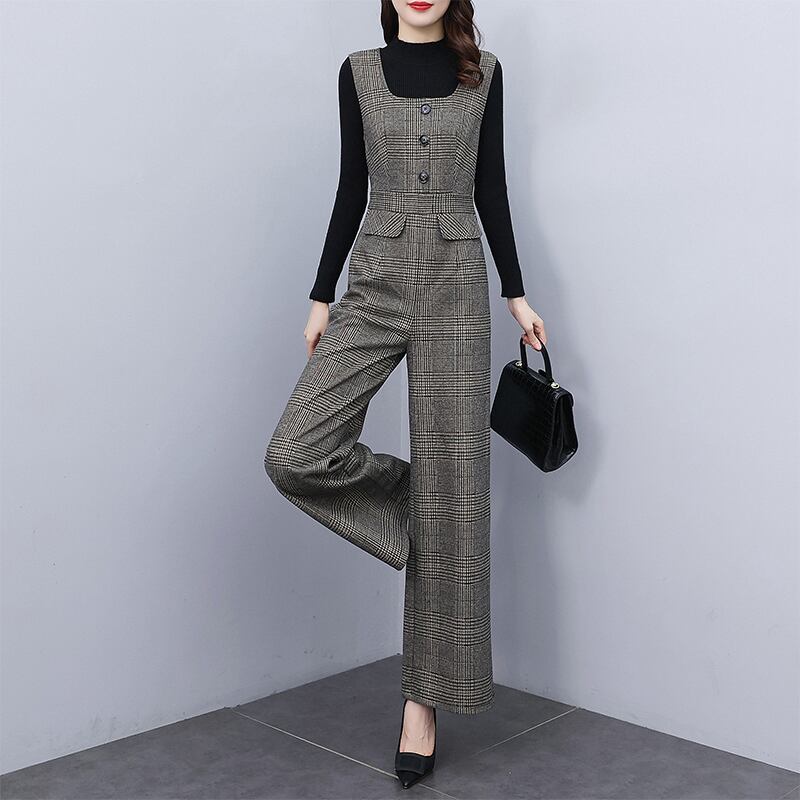 スプリングオータムスタンダードスリム格子柄ジャンプスーツ オールインワン セット レトロ 大きめサイズ 春物 秋物 muto48813222847