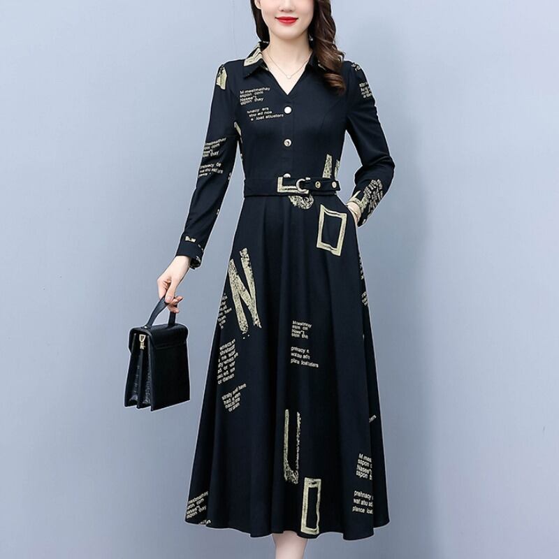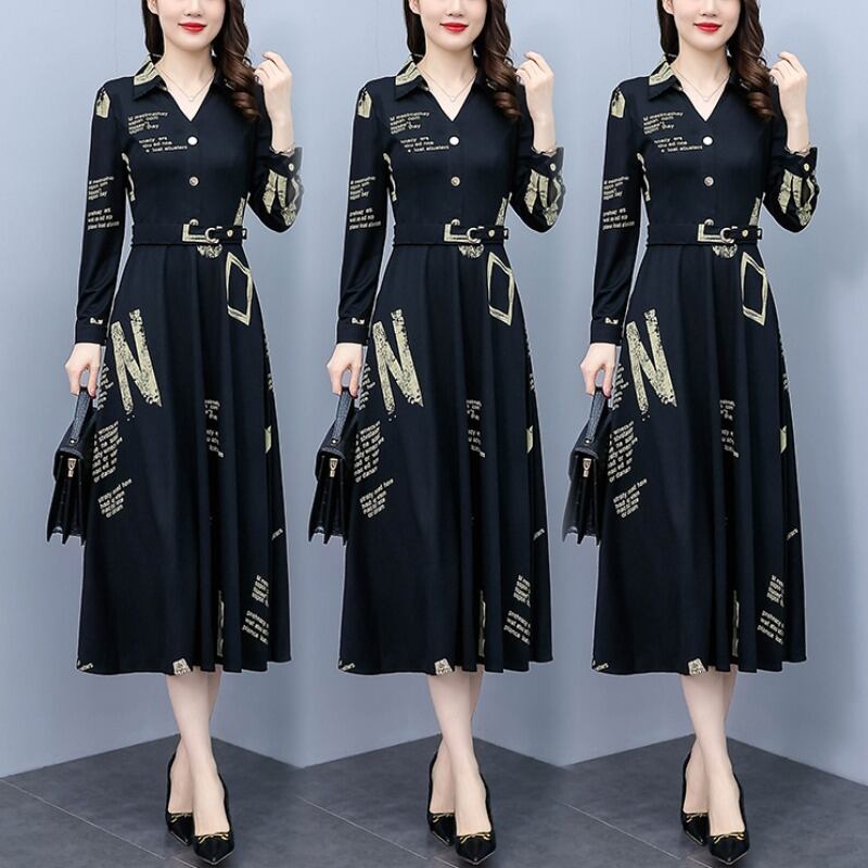 カラープリントドレス オータムスリムスカート ロング 大きめサイズ 秋物 muto52071447107