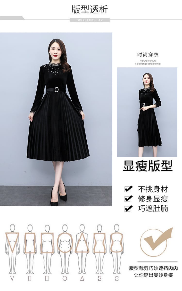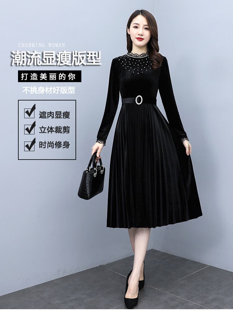 ゴールドベルベットドレス オータムウェスト薄手レーススカート 大きめサイズ 秋物 muto59877976088