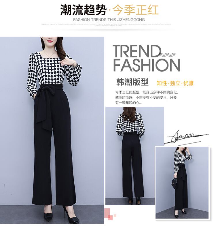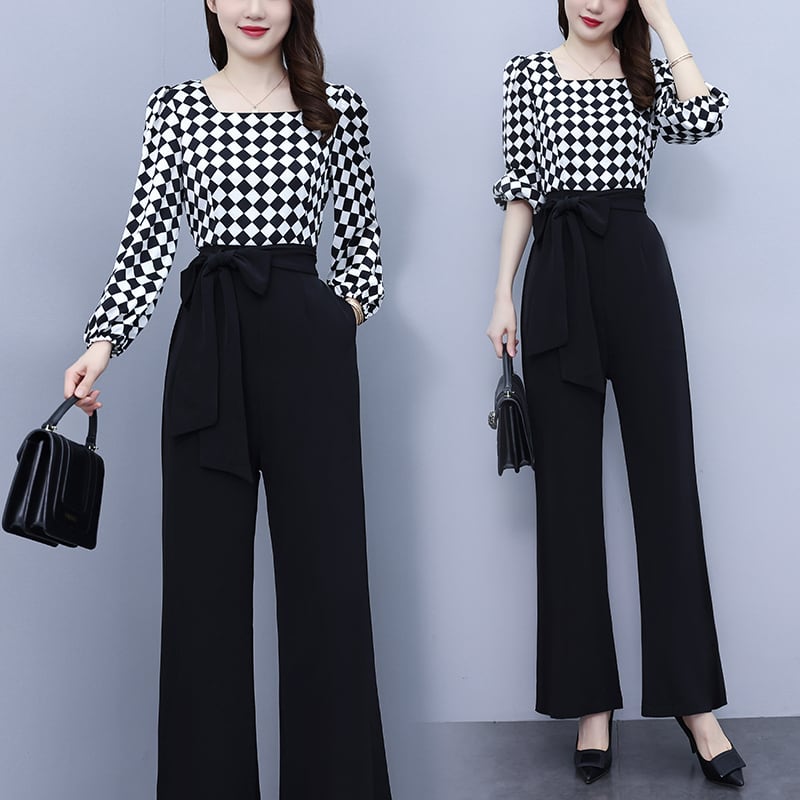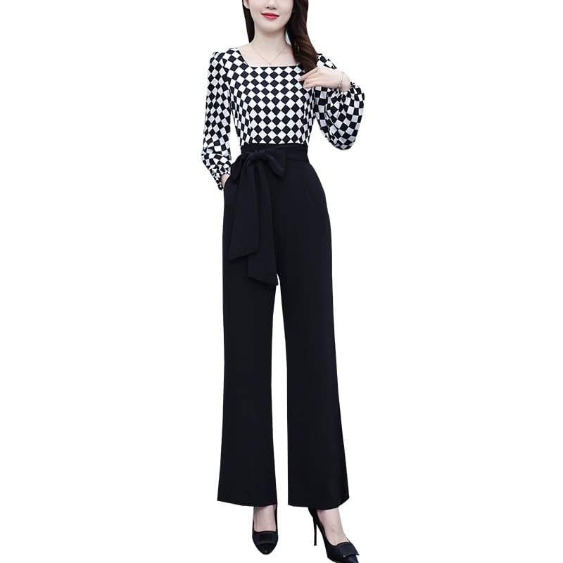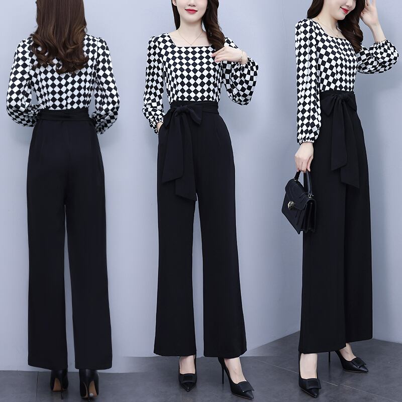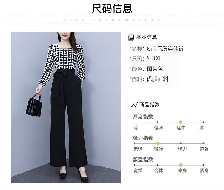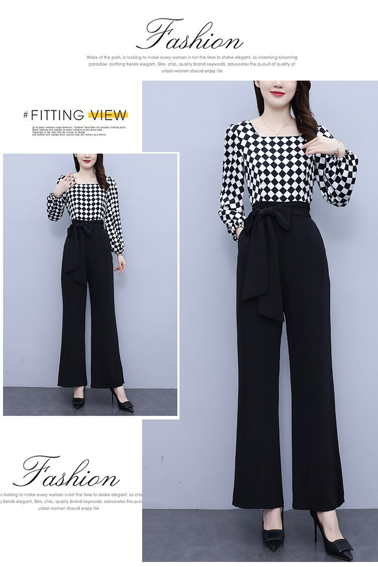 ジャンプスーツ オールインワン オータムハイウェストウェストスリム格子柄ワイドレッグパンツ 大きめサイズ 秋物 ワイドパンツ ステッチ muto82585728353