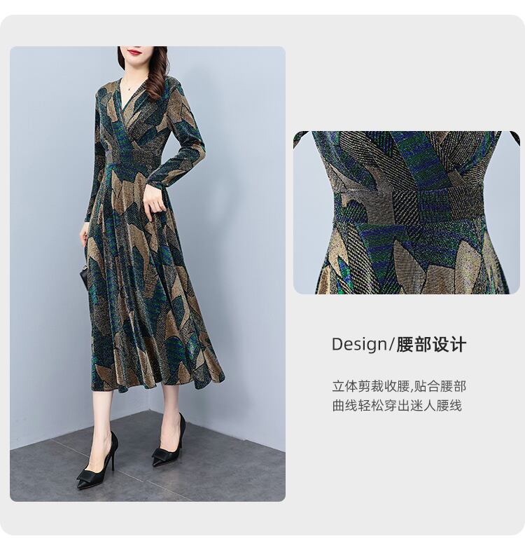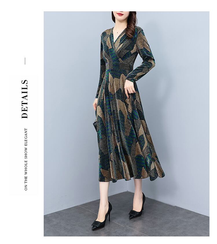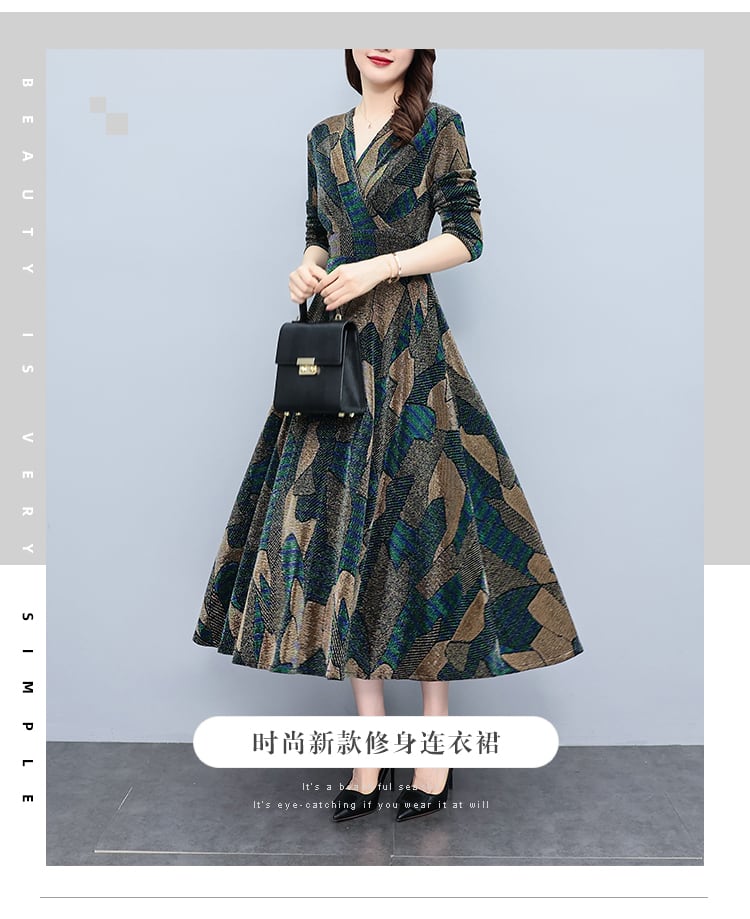 プリントVネックドレス オータムAラインスカート 大きめサイズ 秋物 muto83164567735
